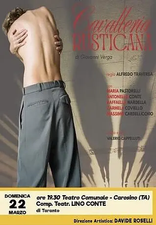 Prossimo appuntamento, alle ore 19.30 di domenica 22 marzo, presso il Teatro Comunale di Carosino (ticket 6 €), vedrà la “Compagnia Teatrale Lino Conte” portare in scena un grande classico: “Cavalleria rusticana” di Giovanni Verga!