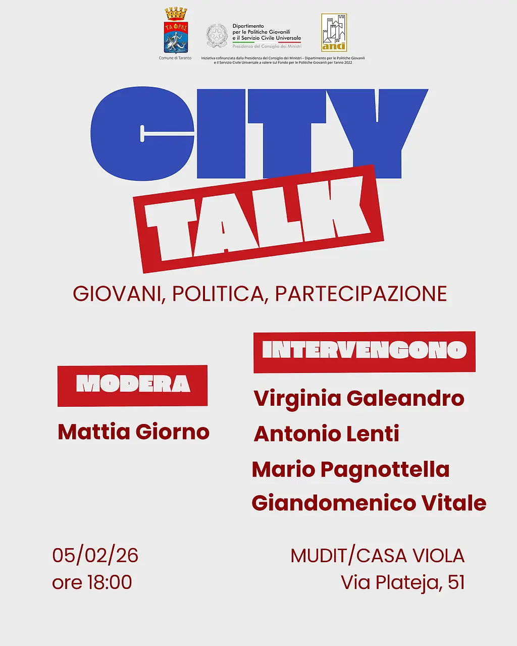 Il Comune di Taranto, nell’ambito del Progetto ERATO, organizza il City Talk “Giovani, Politica, Partecipazione”, in programma giovedì 5 febbraio 2026, alle ore 18:00, presso il MUDIT – Casa Viola, in via Plateja, 51.