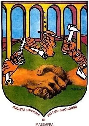 Tale vocazione è ben sintetizzata dallo stemma sociale realizzato dal maestro Nicola Andreace: in primo piano sono presenti due mani che si stringono, le quali, oltre a essere l’emblema canonico delle Società di Mutuo Soccorso, simboleggiano la fratellanza che dovrebbe sussistere tra gli esseri umani; esse sono sormontate da altre mani che impugnano determinati attrezzi e utensili a indicare Arti e Mestieri; sullo sfondo, invece, è raffigurato un ponte, elemento architettonico caratteristico di Massafra, che è anche una metafora di unione e rappresenta altresì una struttura idonea al superamento degli ostacoli.