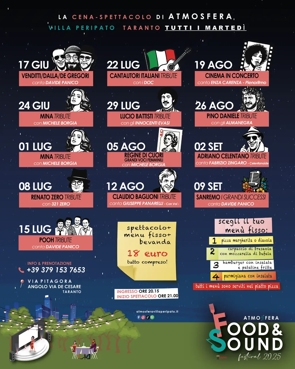 Prende il via martedì 17 giugno l’edizione 2025 di Food & Sound, la rassegna estiva di cene-spettacolo organizzata da Il Palcoscenico nell’area “Atmosfera” della Villa Peripato di Taranto. In programma tredici appuntamenti, tutti i martedì fino al 9 settembre, tra cucina locale e musica dal vivo, con omaggi ai grandi nomi della musica italiana.