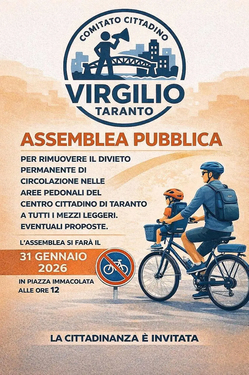 Si svolgerà sabato 31 gennaio alle 12:00 in piazza Immacolata a Taranto un’assemblea pubblica per “rimuovere il divieto permanente di circolazione nelle aree pedonali del centro cittadino di Taranto a tutti i mezzi leggeri” , l’iniziativa è promossa dal Comitato Virgilio , la nuova realtà nata di recente dalla passione e dal senso di appartenenza di un gruppo di persone con la mission di “curare” il Borgo di Taranto: cuore vivo della Città, luogo di storia, d’incontri e di quotidianità. L’Assamblea pubblica ha lo scopo di sensibilizzare i Cittadini di Taranto e gli organi competenti per rendere il Borgo più “ecosostenibile” e “vivibile”. Vi aspettiamo sabato 31 gennaio alle ore 12:00 per discutere ed avanzare eventuali proposte agli organi competenti.
