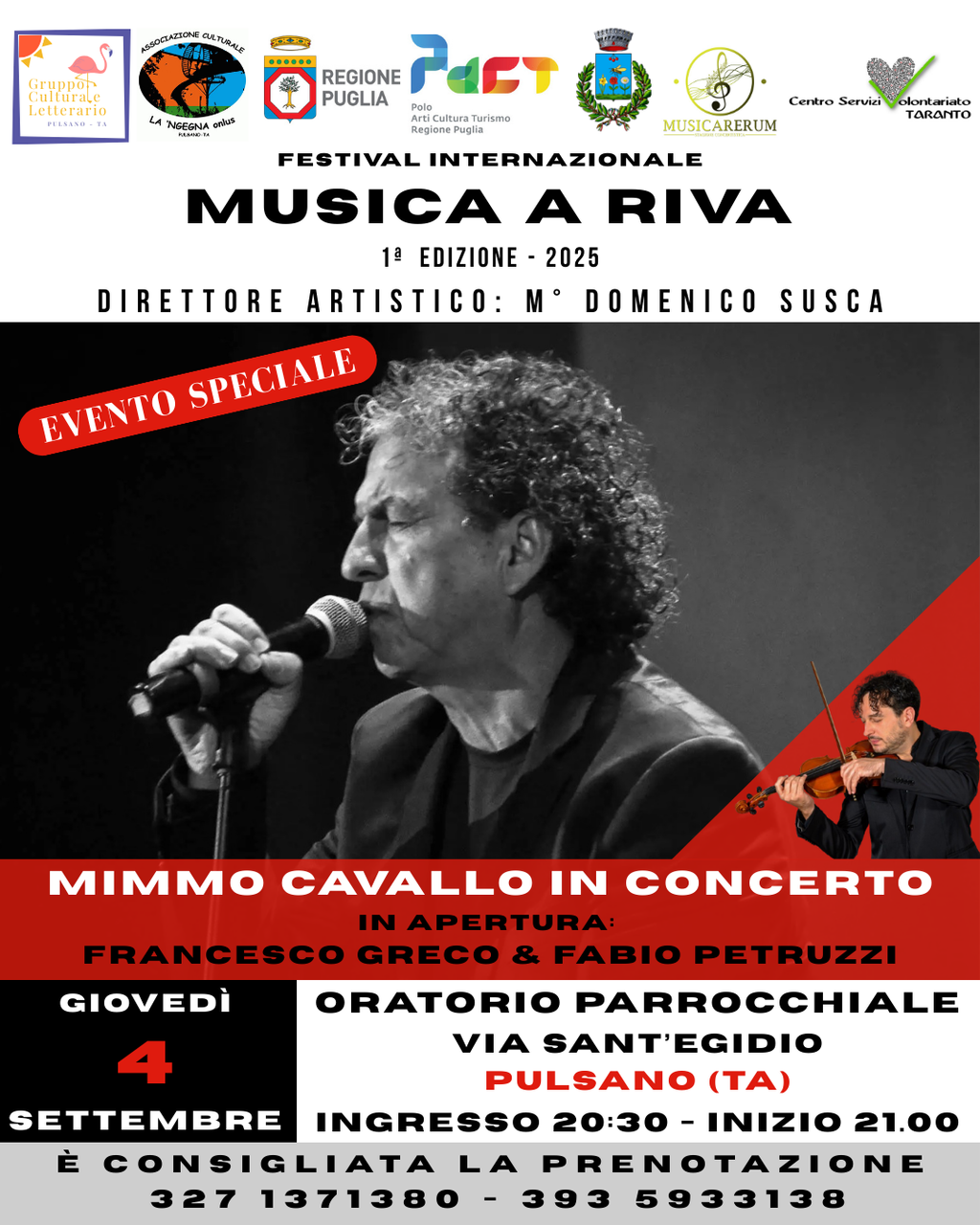 L’evento, patrocinato dalla Regione Puglia e dal Comune di Pulsano (assessore alla Cultura Antonella Lippolis), rientra nella stagione Musica a Riva, diretta dal maestro Domenico Susca, e vede la collaborazione delle associazioni Gruppo Culturale Letterario, presieduto da Gian Carlo Lisi, e La ’Ngegna, diretta da Maria Guglielmetti.