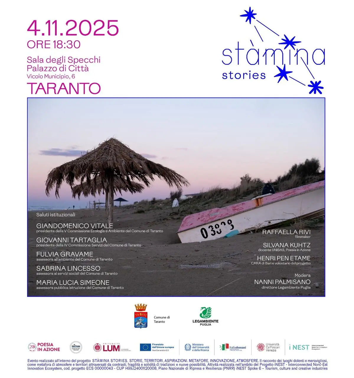 Si terrà lunedì 4 novembre alle ore 18, presso la Sala degli Specchi di Palazzo di Città a Taranto, la presentazione ufficiale del progetto “Stàmina-stories”, alla presenza di rappresentanti istituzionali, docenti, artisti e realtà associative coinvolte. L’incontro sarà un momento di confronto pubblico per condividere esperienze e visioni, con l’obiettivo di avviare laboratori di arte pubblica e percorsi di cittadinanza attiva nella città dei due mari.