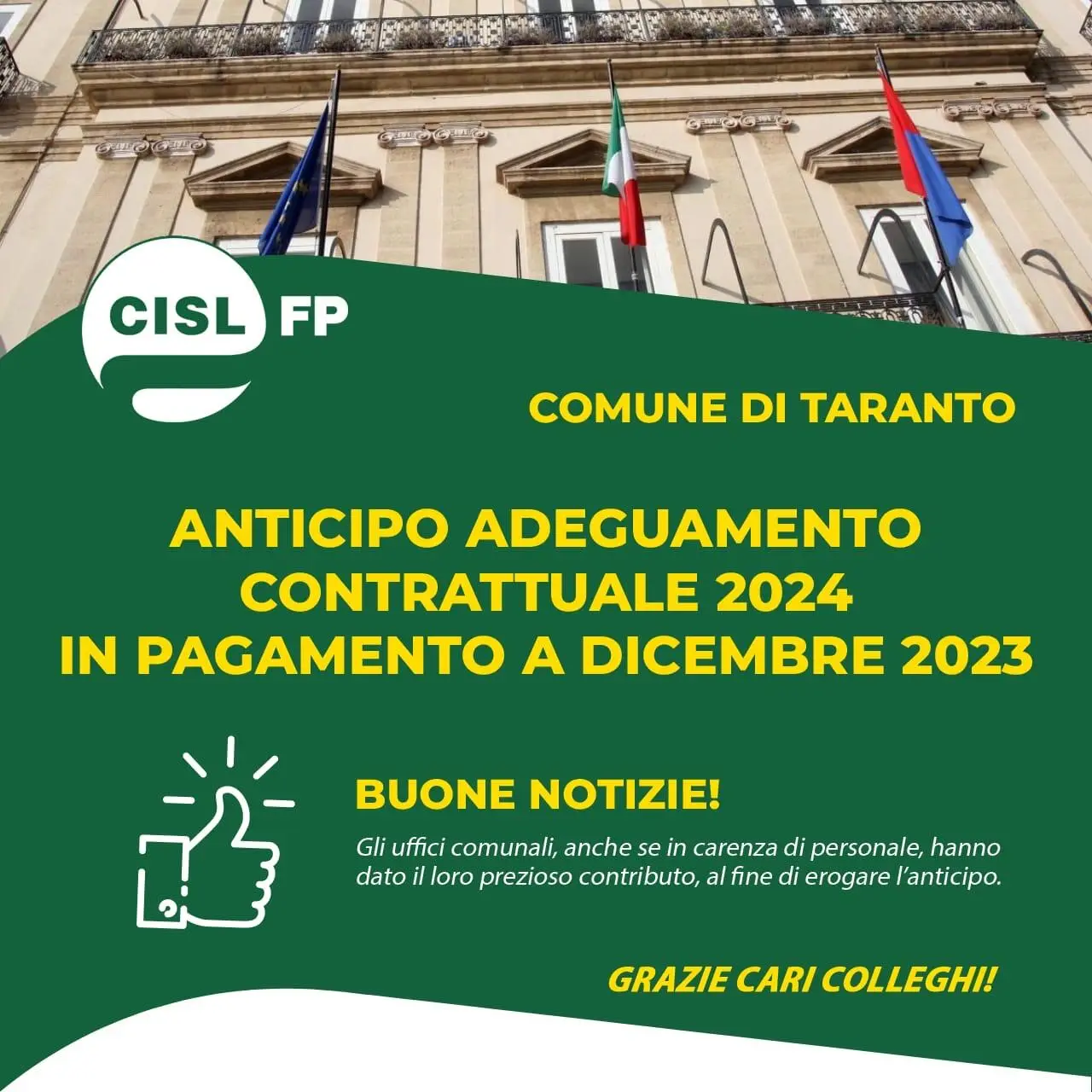 In attesa del rinnovo contrattuale 2022/2024, la Cisl FP del Comune di Taranto ha chiesto ed ottenuto dal Comune di Taranto l’erogazione dell'anticipo contrattuale nella busta paga con valuta 22 dicembre 2023, così come prevede DL "Anticipi", con risorse proprie di bilancio.