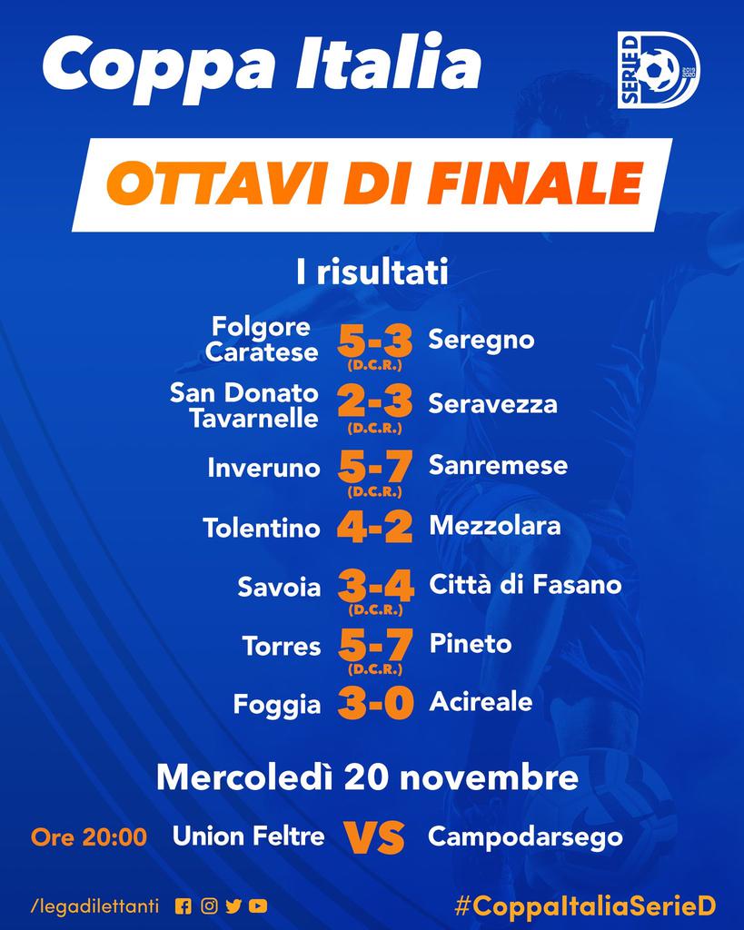 Con la rete di Gentile e la doppietta di Gerbaudo, il Foggia riscatta la sconfitta interna con il Sorrento in campionato, rifila un tris all'Acireale guadagnando il passaggio ai quarti di finale di Coppa Italia. Dove ad attenderlo c'è il Fasano, che ha superato il Savoia ai calci si rigore. Ecco il quadro completo degli ottavi, che si completerà mercoledì 30 novembre con la sfida tra Union Feltre e Campodarsego.
