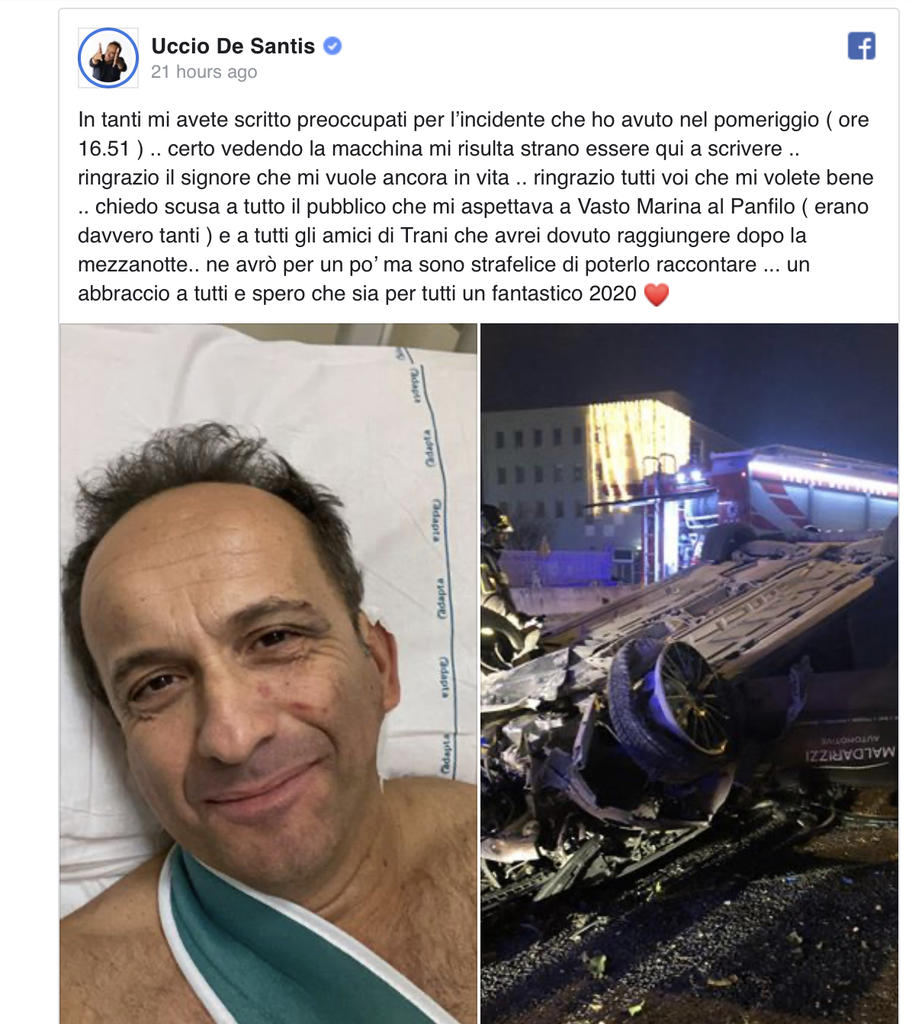 Incidente stradale per il comico Uccio De Santis, nella serata dì martedì 31 dicembre, mentre viaggiava sulla provinciale Bari-Bitritto, nei pressi dello stadio San Nicola. Secondo le prime ricostruzioni, la sua auto si è ribaltata. Trasportato al Policlinico di Bari, le sue condizioni non sono gravi: ha una spalla fratturata. Uccio De Santis era diretto a Vasto per la festa di piazza, dopodiché si sarebbe dovuto dirigere a Trani. L'attore ha pubblicato su Facebook la sua foto in ospedale e quella dell’auto ribaltata e distrutta rassicurando tutti i suoi fan. "In tanti mi avete scritto preoccupati per l’incidente che ho avuto nel pomeriggio - scrive su Facebook -. Certo vedendo la macchina mi risulta strano essere qui a scrivere. Ringrazio il signore che mi vuole ancora in vita, ringrazio tutti voi che mi volete bene, chiedo scusa a tutto il pubblico che mi aspettava a Vasto Marina al Panfilo (erano davvero tanti) e a tutti gli amici di Trani che avrei dovuto raggiungere dopo la mezzanotte. Ne avrò per un po' ma sono strafelice di poterlo raccontare. Un abbraccio a tutti e spero che sia per tutti un fantastico 2020".
