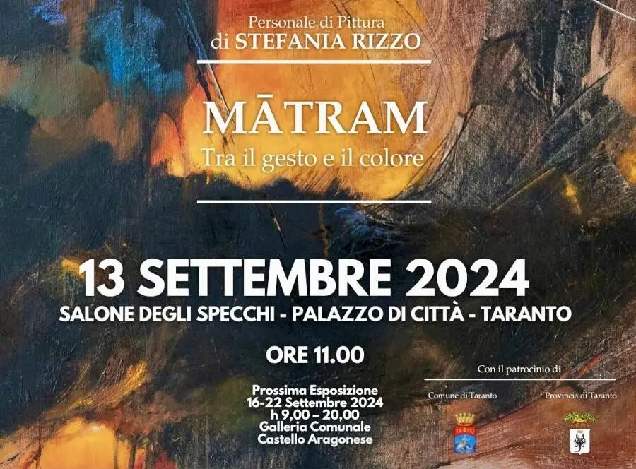 “MĀTRAM Tra il gesto e il colore” sarà presentato in una conferenza stampa il prossimo 13 settembre, alle ore 11, al Salone degli Specchi di Palazzo di Città a Taranto.