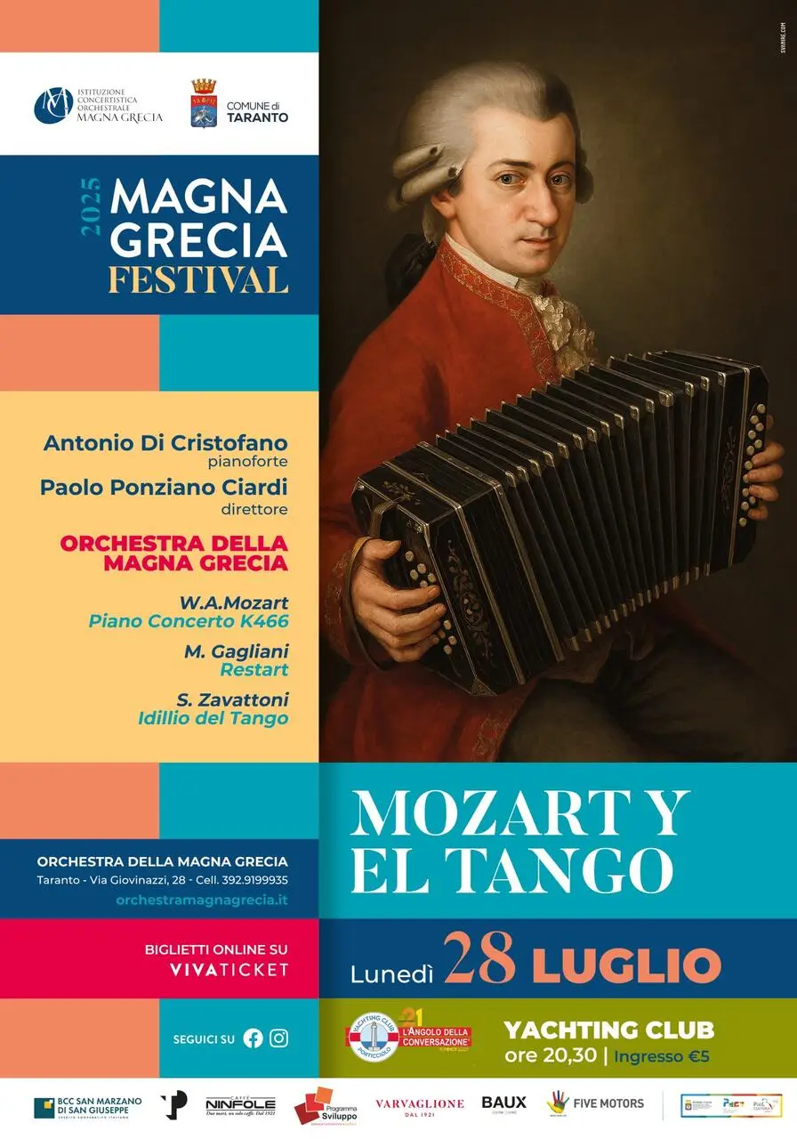 Dopo il secondo sold out consecutivo registrato con lo spettacolo “Indimenticabile Whitney”, il Magna Grecia Festival prosegue lunedì 28 luglio alle ore 20.30 presso lo Yachting Club di San Vito (Taranto) con un nuovo appuntamento musicale: “Mozart y el tango”.