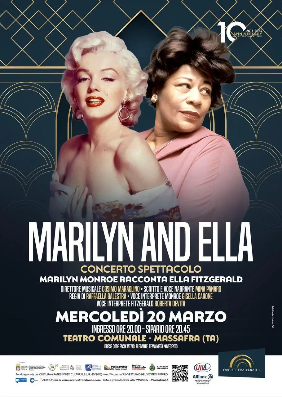 Mercoledì 20 marzo, nel teatro comunale “Nicola Resta” di Massafra (Ta), con sipario alle 20.45, l’orchestra Tebaide d’Italia proporrà il concerto spettacolo “Marilyn and Ella – Marilyn Monroe racconta Ella Fitzgerald”, scritto da Mina Panaro con la regia di Raffaella Balestra e la direzione musicale del maestro Cosimo Maraglino.