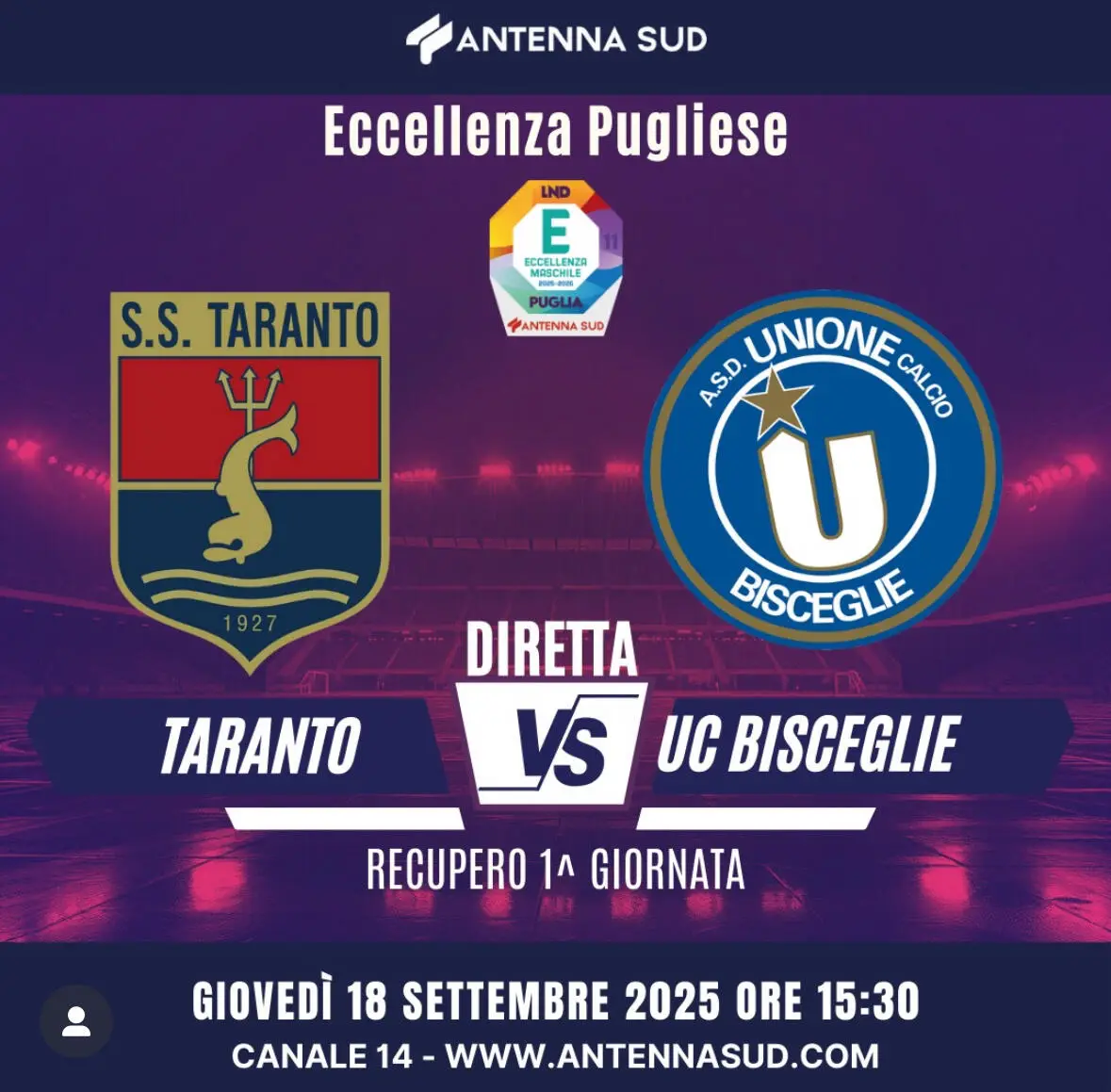 Giovedì 18 settembre, alle 15:30, lo stadio Italia di Massafra ospiterà la sfida tra Taranto e UC Bisceglie, valida per il recupero della prima giornata del campionato di Eccellenza pugliese. Il match sarà trasmesso in diretta su Antenna Sud: canale 14 e in streaming su www.antennasud.com. Un incontro che mette in palio punti importanti: con un successo, il Taranto balzerebbe in vetta alla classifica.
