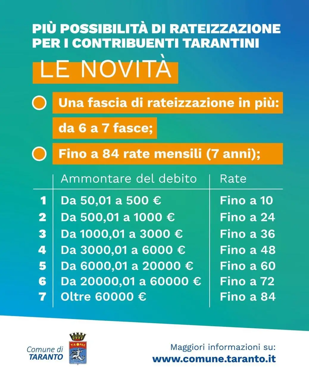Rispetto alla precedente modulazione, la vecchia fascia da 500,01 a 3000 euro è stata divisa in due fasce a beneficio dei debitori più “piccoli”, consentendo di aumentare il numero delle rate per tutti gli scaglioni. Tra le altre novità introdotte, inoltre, spicca la possibilità per società partecipate dal Comune di Taranto e amministrazioni pubbliche di non dover presentare la garanzia per le richieste di rateizzazione avanzate.