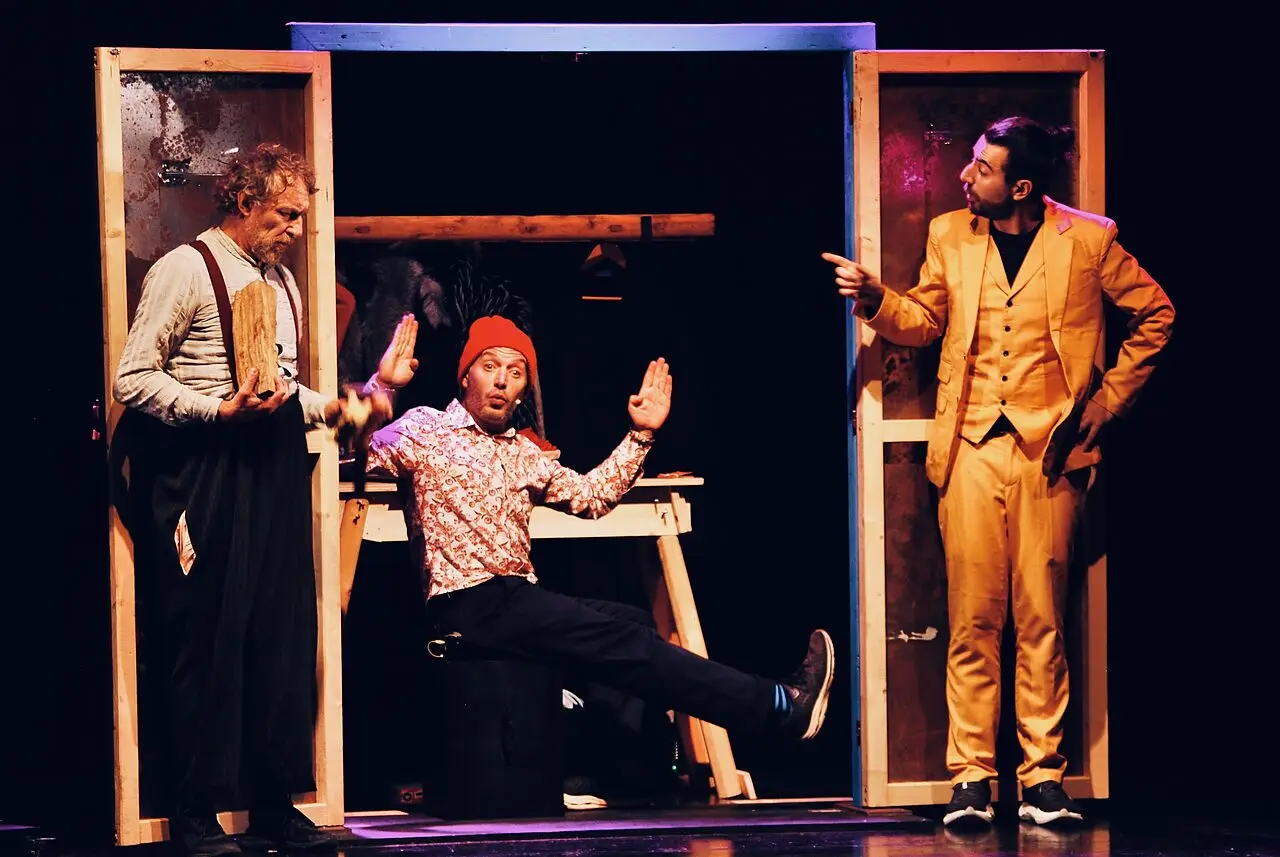 In scena Giacomo Dimase, Luigi Tagliente ed Enrico Vezzelli, che animano lo spazio con abiti di scena, burattini e oggetti sorprendenti. Tra i personaggi compaiono un Fato dal vistoso abito giallo, un pescecane volante, un ciocco di legno e un attore alle prese con il desiderio, complesso e urgente, di essere un buon padre.