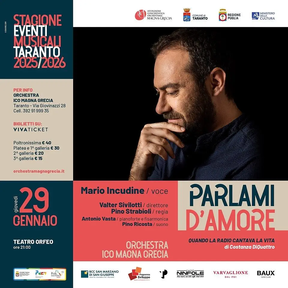 L’appuntamento rappresenta il nono evento della Stagione Eventi musicali 2025/2026, giunta alla trentatreesima edizione e realizzata dall’Orchestra ICO della Magna Grecia con il Comune di Taranto, la Regione Puglia e il Ministero della Cultura, sotto la direzione artistica del Piero Romano, in collaborazione con realtà del territorio.