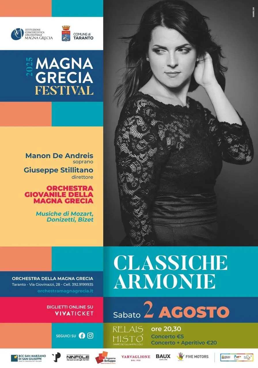 Sabato 2 agosto alle ore 20.30, la suggestiva cornice del Relais Histò – San Pietro sul Mar Piccolo ospiterà il quarto appuntamento del Magna Grecia Festival 2025, con un evento intitolato “Classiche armonie”. Protagonista della serata sarà l’Orchestra giovanile della Magna Grecia – Città di Taranto, diretta dal Maestro Giuseppe Stillitano, con la partecipazione del soprano Manon De Andreis.