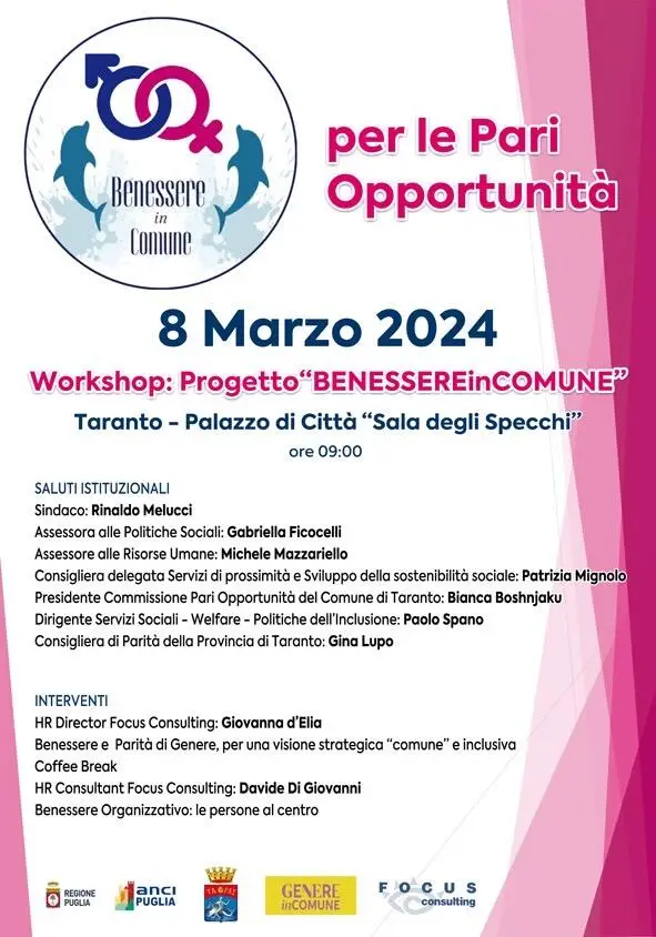 I lavori saranno aperti dai saluti di Rinaldo Melucci, Sindaco di Taranto, Gabriella Ficocelli, Assessore ai Servizi Sociali, Michele Mazzariello, Assessore alle Risorse Umane, Patrizia Mignolo, Consigliera delegata ai servizi di prossimità e sviluppo della sostenibilità sociale, Bianca Boshnjaku, Presidente Commissione Pari Opportunità Comune di Taranto, e Gina Lupo, Consigliera di Parità della Provincia di Taranto. Seguiranno gli interventi di Giovanna D’Elia, HR Director Focus Consulting, su “Benessere e Parità di Genere, per una visione strategica ‘comune’ e inclusiva” e, dopo il coffee break, di Davide Di Giovanni, HR Consultant Focus Consulting, su “Benessere Organizzativo: le persone al centro”.