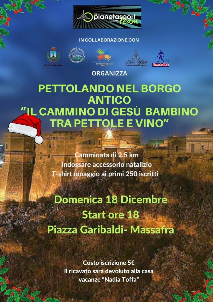 A Massafra si respira aria di festa e di Natale, in questo clima si inserisce la manifestazione “Pettolando nel borgo antico – il cammino di Gesù Bambino tra pettole e vino” organizzata dall’ASD Team Pianeta Sport Massafra in collaborazione con il Comune di Massafra, l’associazione Sorriso Francescano e l’azienda Pianeta Sport.
