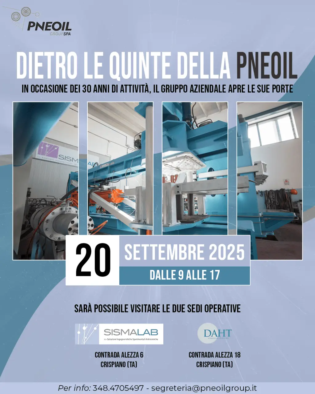 In occasione dei 30 anni del Pneoil Group, sabato 20 settembre a Crispiano sarà possibile visitare le sedi aziendali di Sismalab (contrada Alezza, 6) e di Daht (contrada Alezza, 18). Uno speciale open day per far conoscere a chiunque il dietro le quinte del gruppo aziendale e per condividere il percorso di questi anni con il territorio in cui da sempre opera.
