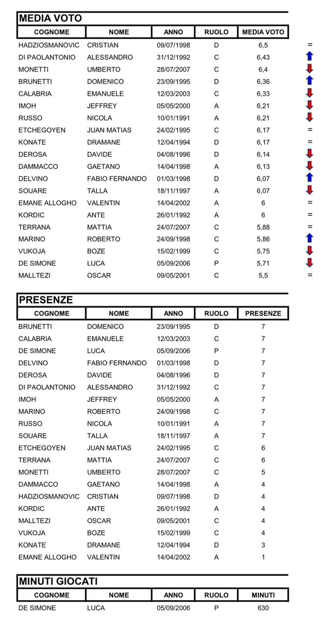 Taranto, statistiche e medie voto dopo la 7a Giornata