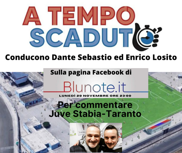 Questa sera lunedì 29 novembre dalle ore 23:00, appuntamento con “A TEMPO SCADUTO”, il contenitore sportivo a cura della redazione di Blunote.it: analizzeremo a caldo la gara Juve Stabia-Taranto con le vostre domande e considerazioni. Ospiti di Dante Sebastio ed Enrico Losito: Alessandro Ambrosi, ex calciatore e doppio ex del confronto; Paolo Tricoli, procuratore sportivo e agente di Giuseppe Giovinco, e Antimo Di Lorenzo, procuratore sportivo. Vi aspettiamo in diretta sulla pagina ufficiali Facebook e Youtube di Blunote Web dalle ore 23:00! Il programma è stato realizzato grazie al supporto di Birroteca Puglia in Via Nitti, 14 a Taranto; Pausa Caffè in Viale Trentino 5B-7 a Taranto; Hotel Virgilio in Viale Virgilio, 4 a Taranto; Ipersport in via per S. Giorgio Jonico km 10 (contrada Cimino) a Taranto; Elettrica Martino in Via De Cesare, 8/10 a Taranto; IL.MET in via Abruzzo, 73 a Taranto e inMasseria, via Liguria, 43 a Taranto.
