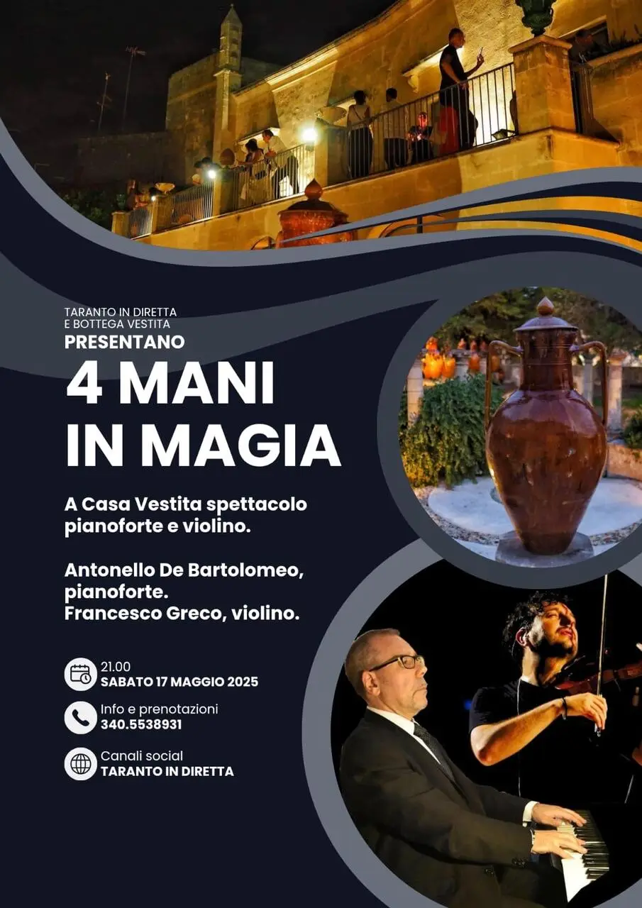 Sabato 17 maggio, alle 21, il suggestivo Quartiere delle Ceramiche di Grottaglie ospiterà “4 mani in magia”, serata tra arte, musica e cultura organizzata dall’associazione Taranto in Diretta con la collaborazione della famiglia Vestita.