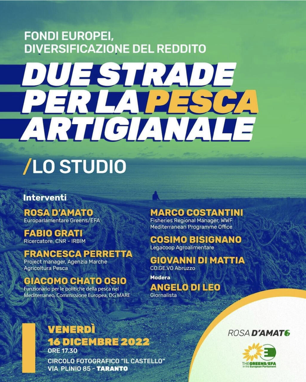 Interverranno ROSA D’AMATO - Europarlamentare Greens/Efa. FABIO GRATI - Ricercatore Cnr-Irbim, e FRANCESCA PERRETTA Project manager, Agenzia Marche Agricoltura Pesca (che hanno firmato lo studio commissionato dall'on. Rosa D'Amato). GIACOMO CHATO OSIO - Funzionario per le politiche della pesca nel Mediterraneo, Commissione Europea, Dg Mare. MARCO COSTANTINI - Fisheries Regional Manager, Wwf Mediterranean Programme Office. COSIMO BISIGNANO - Legacoop Agroalimentare. GIOVANNI DI MATTIA - Co.Ge.Vo Abruzzo. L’appuntamento è per venerdì 16 dicembre 2022, ore 17.30, nella sede del Circolo fotografico “Il Castello” in via Plinio 85 a Taranto