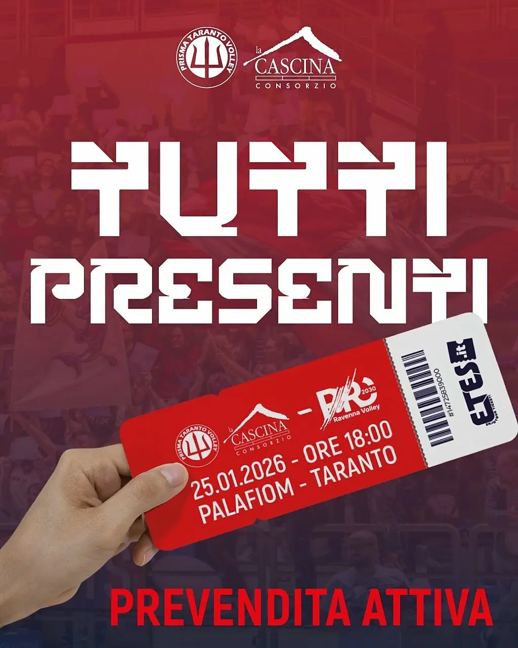 È attiva la prevendita dei tagliandi relativi all’incontro Prisma Taranto-Consar Ravenna, valevole per la 16a giornata della Serie A2 maschile di volley in programma alle 18.00 di domenica 25 gennaio al Palafiom.