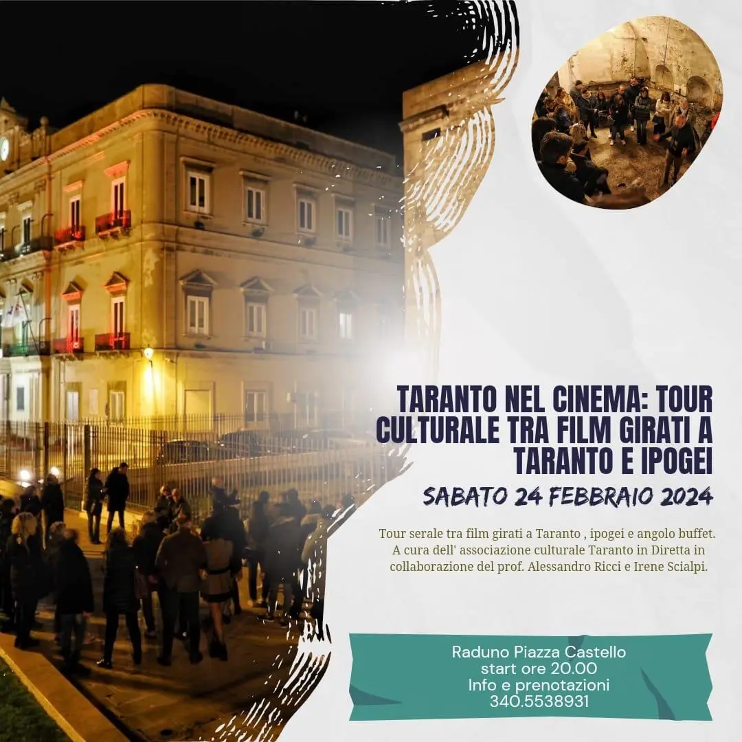 'Taranto nel cinema: tour culturale tra film girati a Taranto e ipogei', è questo il tema dell'appuntamento itinerante proposto dall'Associazione Culturale “Taranto In Diretta” per l'ultima bella settimana di Febbraio a Taranto. Si tratta di una visita guidata inedita, che grazie alla collaborazione sinergica di Alessandro Ricci , archeologo e guida specializzata, l'Associazione Itaca di Irene Scialpi , con il coordinamento di Angelo Galasso di Taranto In Diretta condurrà alla scoperta di curiosità, aneddoti e luoghi dove si sono girate le scene più belle e interessanti di alcuni dei numerosi film e fiction Ambientare a Taranto. Non sarebbe un sabato sera, senza un piccolo momento di ristoro, che sarà servito ai partecipanti presso l'appartamento nobiliare di Palazzo Stola. L'appuntamento è alle ore 20.00 , sabato 24 febbraio presso Piazza Castello. Durata prevista, 2 ore circa. Abbigliamento comodo. Posti limitati. Contributo di € 12,00. Il tour guidato potrà essere prenotato esclusivamente telefonicamente o su WhatsApp al numero 340.5538931 (Angelo Galasso, Presidente Associazione Culturale Taranto in Diretta).
