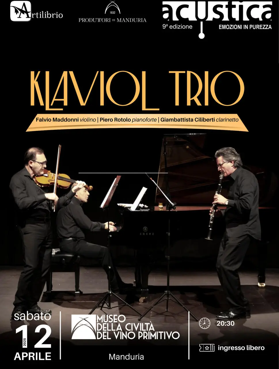 Internazionalità, immediatezza e talento: sono le parole chiave del secondo appuntamento della rassegna Acustica | emozioni in purezza, che sabato 12 aprile vedrà protagonista il Klaviol Trio nel suggestivo scenario del Museo della Civiltà del Vino Primitivo. L’iniziativa, ideata da Salvatore Moscogiuri per Artilibrio, si avvale della partnership organizzativa dei Produttori di Manduria.