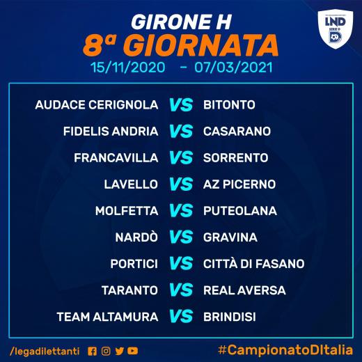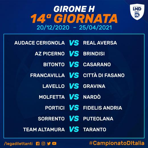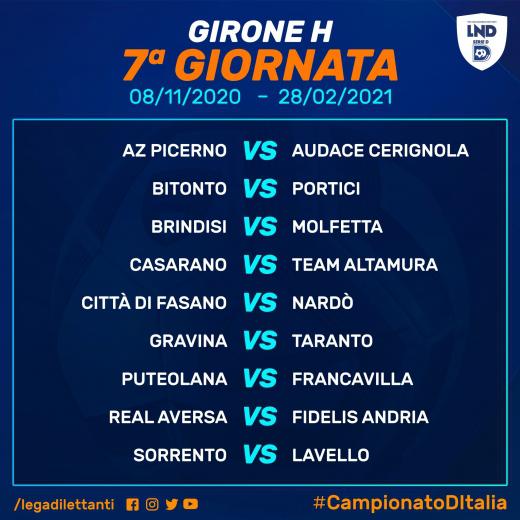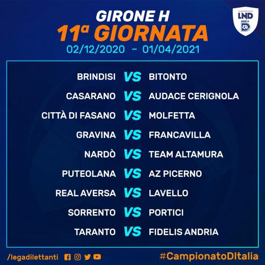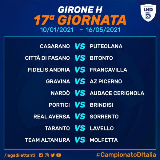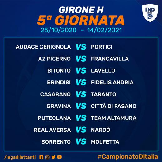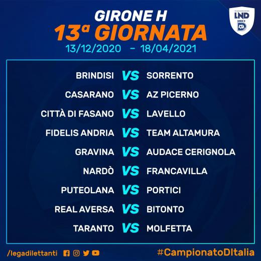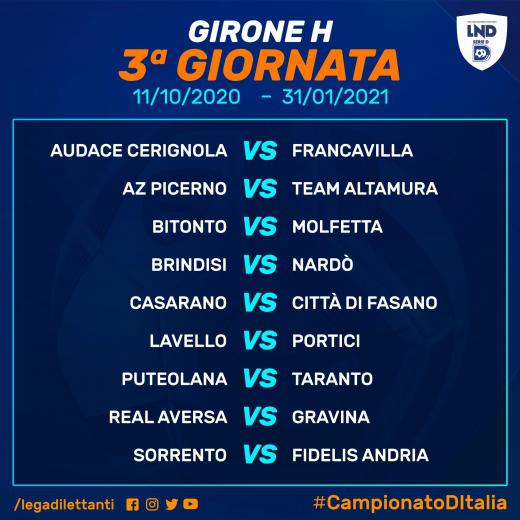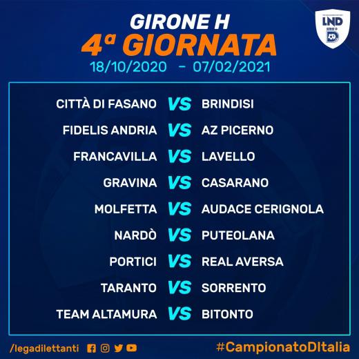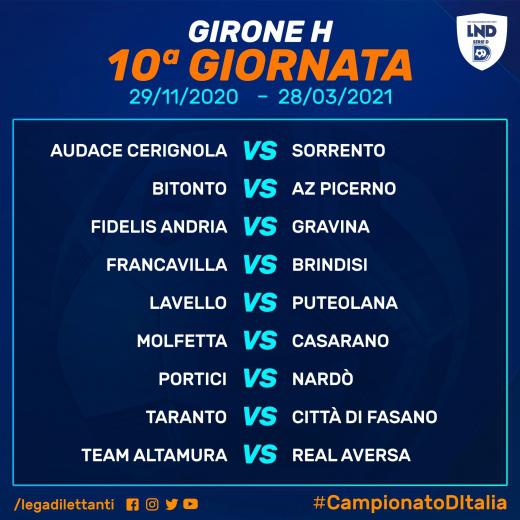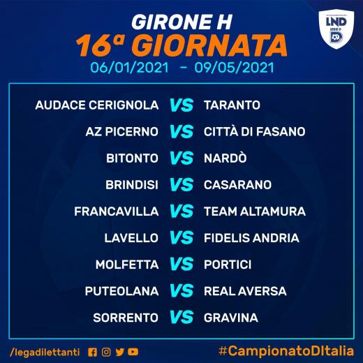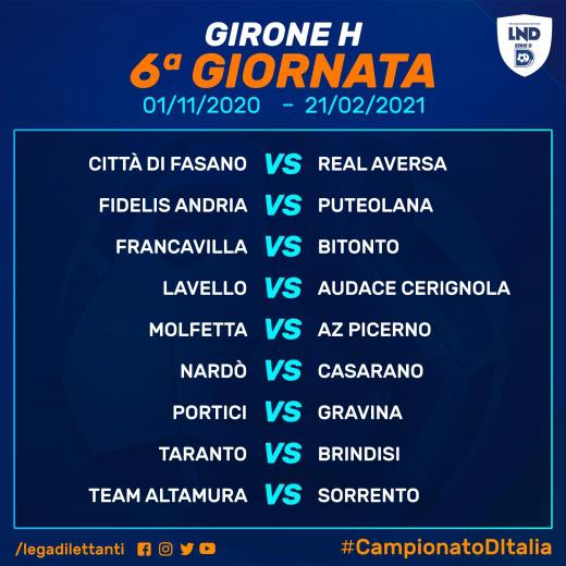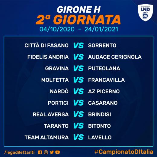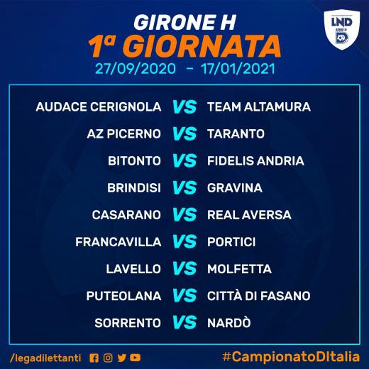 Il Dipartimento Interregionale ha pubblicato i calendari della stagione 2020/21 che prenderà il via il prossimo 27 settembre per concludersi il 16 maggio. Un viaggio appassionante da nord a sud della penisola che come ogni anno metterà a confronto sul palcoscenico nazionale le aspirazioni di grandi città e piccoli borghi. Il girone di andata terminerà il 10 gennaio. Un solo turno infrasettimanale per tutti i gironi fissato per il 2 dicembre, l’11^ giornata, la 13^ per i Gironi A e C. Per quest’ultimi due campionati a venti squadre sono previsti altri quattro turni infrasettimanali, due nel 2020 e altrettanti nel 2021, l’andata e ritorno della 3^ e dell’8^ giornata: il 7 ottobre, il 4 novembre, il 27 gennaio e il 24 febbraio. Per le festività natalizie la 15^ giornata (la 17^ per i gironi A e C) è anticipata dal 27 al 23 dicembre mentre la 16^ (18^ per A e C) è posticipata dal 3 al 6 gennaio. Stesso discorso per la domenica di Pasqua, l’11^ di ritorno (la 13^ per A e C) è anticipata da domenica 4 a giovedì 1 aprile. Il 14 marzo tutto il campionato osserverà un turno di riposo per la partecipazione della Rappresentativa D alla Viareggio Cup. Fino al 24 ottobre le gare inizieranno alle 15.00, dal 25 ottobre al 27 marzo prenderanno il via alle 14.30, dal 28 marzo all’8 maggio alle 15.00, dal 9 maggio fino alla fine della stagione il calcio d’inizio è fissato alle 16.00. IL GIRONE H: La Puglia fa la voce grossa con ben undici squadre che daranno pepe al campionato con almeno un derby in ogni giornata. Completano il girone tre squadre lucane e quattro campane. Il Taranto nel girone d’andata giocherà in casa i derby più sentiti con Bitonto, Brindisi, Fasano e Andria. Per gli ionici subito una trasferta insidiosa a Casarano il 25 ottobre e un finale da brividi con la sfida all’Audace Cerignola il 9 maggio. Per il Brindisi sette derby nelle prime otto giornate con Gravina, Nardò, Fasano, Andria, Taranto, Molfetta e Altamura. Inizio duro anche per il Bitonto in casa con l’Andria e a Taranto. Il Cerignola probabile che si giocherà tanto a maggio nelle ultime tre giornate, due in casa con Fasano e Nardò, la terza in trasferta a Taranto. Puteolana-Portici si giocherà il 13 dicembre e il 18 aprile. Esperienza nuova per la Real Aversa che avrò poco tempo per ambientarsi con trasferte in piazze importanti già nel girone d’andata. Il Sorrento invece ha già saggiato il raggruppamento pugliese nella scorsa stagione ed è andata bene. I rossoneri potranno giocarsi in casa le sfide importanti nel girone di ritorno con Taranto, Audace Cerignola, Picerno, Brindisi e Casarano. I potentini del Picerno vivranno un inizio shock in casa con il Taranto e a Nardò poi il calendario inizierà ad armonizzarsi distribuendo i big match con cadenza regolare.