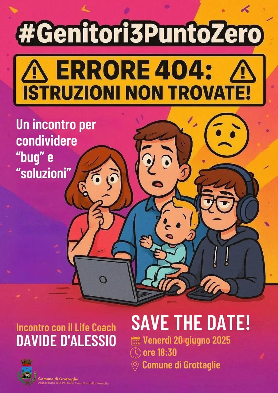 Venerdì 20 giugno 2025, alle ore 18:30, presso l’Aula Consiliare del Comune di Grottaglie, si terrà l’incontro pubblico “#Genitori3PuntoZero – Errore 404: Istruzioni non trovate!”, promosso dall’assessorato alle Politiche sociali e alla Famiglia.