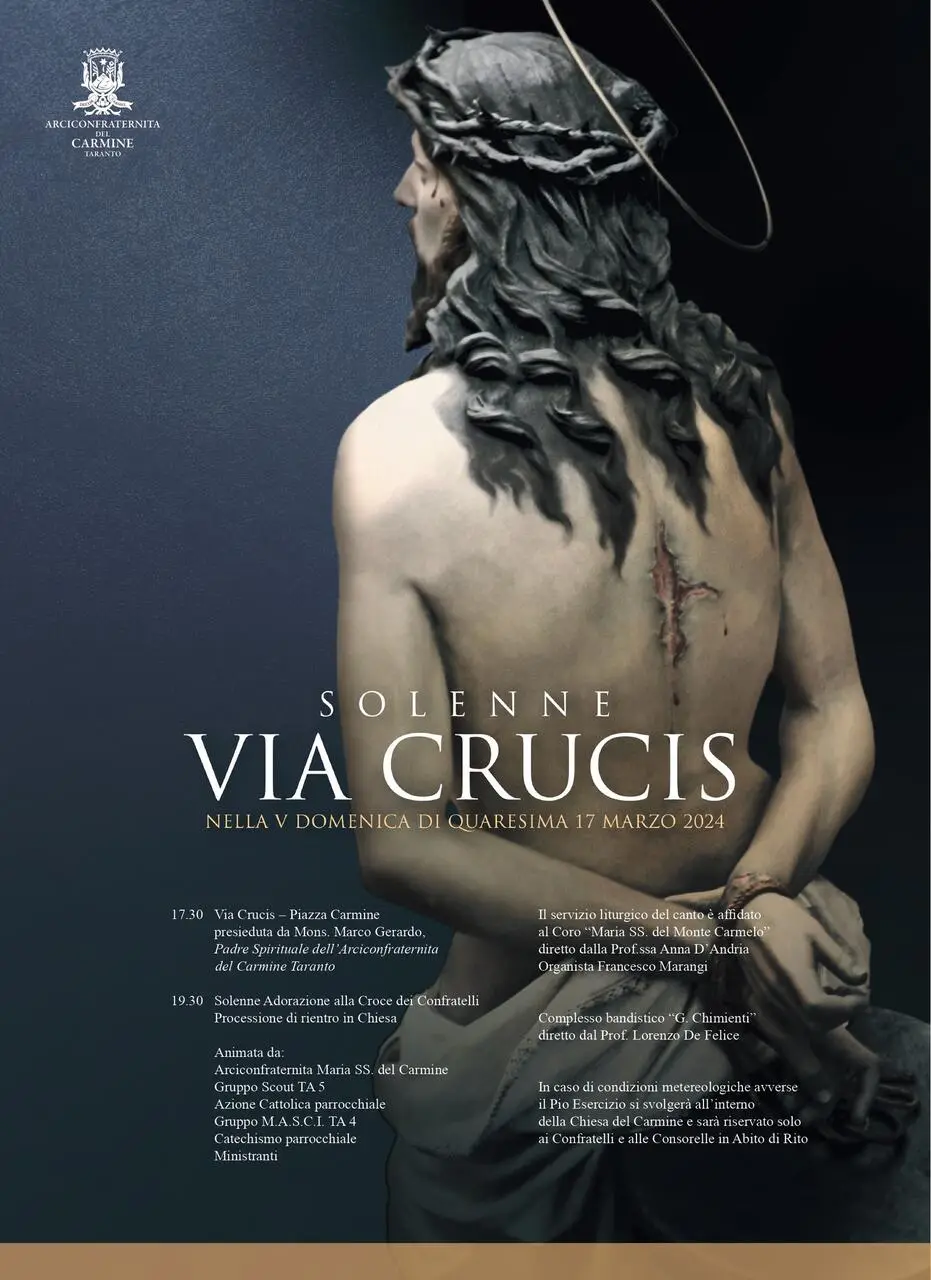 Domenica 17 marzo, quinta e ultima Domenica di Quaresima, si svolgerà in piazza Carmine a Taranto la Solenne Via Crucis, animata dall’Arciconfraternita del Carmine e presieduta dal Padre spirituale Mons. Marco Gerardo.