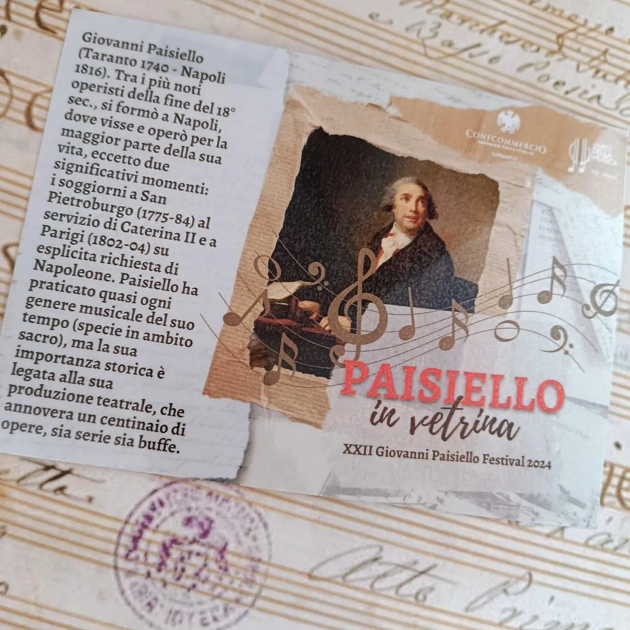 Quest’anno, a fianco del festival, Confcommercio Taranto lancia il progetto “Paisiello in Vetrina” (10-18 ottobre), un’iniziativa ideata da Paolo Ruta, presidente dell’Associazione Amici della Musica ‘Arcangelo Speranza’, e accolta con entusiasmo da Mario Raffo, presidente di Confcommercio Taranto. Il progetto coinvolge venti attività commerciali locali nei settori moda, ottica e oreficeria, i cui negozi hanno allestito vetrine ispirate alla vita e alle opere di Paisiello.