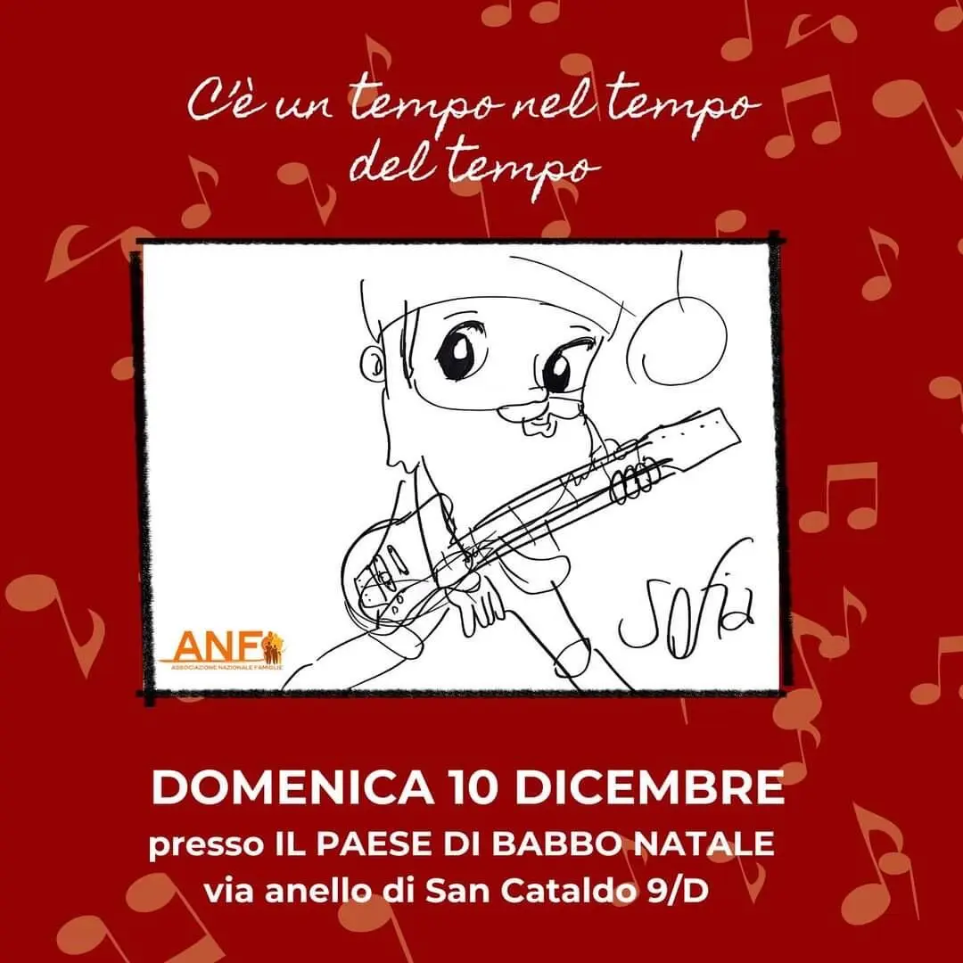 "𝑪'𝒆̀ 𝒖𝒏 𝒕𝒆𝒎𝒑𝒐 𝒏𝒆𝒍 𝒕𝒆𝒎𝒑𝒐 𝒅𝒆𝒍 𝒕𝒆𝒎𝒑𝒐" è un brano inedito che il chitarrista tarantino Egidio Maggio, reduce dal recente tour con Checco Zalone, ha deciso di regalare all'Anf, Associazione Nazionale Famiglie, come colonna sonora in occasione del Paese di Babbo Natale allestito presso la sede di via Anello di San Cataldo 9/d .