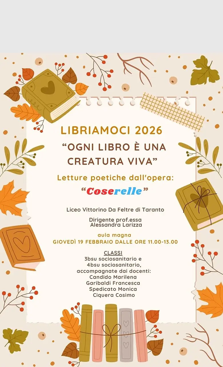 Anche quest’anno il Vittorino da Feltre di Taranto ha aderito alla XII edizione di “Libriamoci 2026”, la campagna nazionale rivolta alle scuole di ogni ordine e grado, in Italia e all’estero, in programma dal 16 al 20 febbraio 2026. L’iniziativa è promossa dal Centro per il libro e la lettura, dal Ministero dell’Istruzione e del Merito e dal Ministero della Cultura.