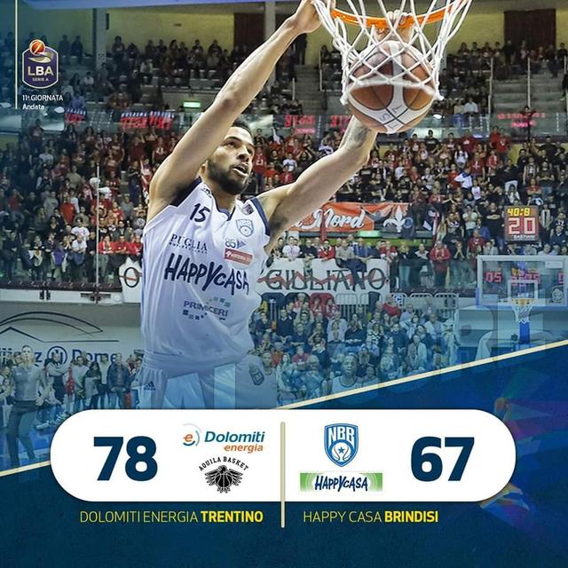 Happy Casa rimandata al primo esame della partita affrontata senza il proprio capitano Adrian Banks, volato in America per la nascita del terzo figlio. Prima metà di partita davvero poco gradevole, con entrambe le squadre che commettono tanti errori e nessuna delle due che mette allunghi importanti. Per Brindisi i più in palla sono Martin e Brown. A metà partita il punteggio è 34 a 31 per Trento. Nel terzo quarto Brindisi parte meglio e sembra poter prendere il controllo. Thompson ne mette 6 consecutivi e scrive il +7, massimo vantaggio, ma quest'inerzia dura poco. Blackmon spara 3 bombe e riporta i suoi a ridosso nel punteggio. Fra terzo e ultimo quarto il parziale di Trento diventa di 10 a 0 e i padroni di casa vanno sul più 5. Brindisi non riesce a sbloccarsi e alterne scelte sbagliate ad attacchi frettolosi. Pascolo, che gioca la sua miglior partita dall'inizio dell'anno, segna i punti del più 8 e nel finale la chiude di nuovo Gentile. Il passivo finale di meno 11 (78 67) è un po' troppo pesante, ma la prova di Brindisi ha ben poco da salvare. Prossimo incontro mercoledì sera in Champions League a Saragozza, trasferta complicata in terra iberica.