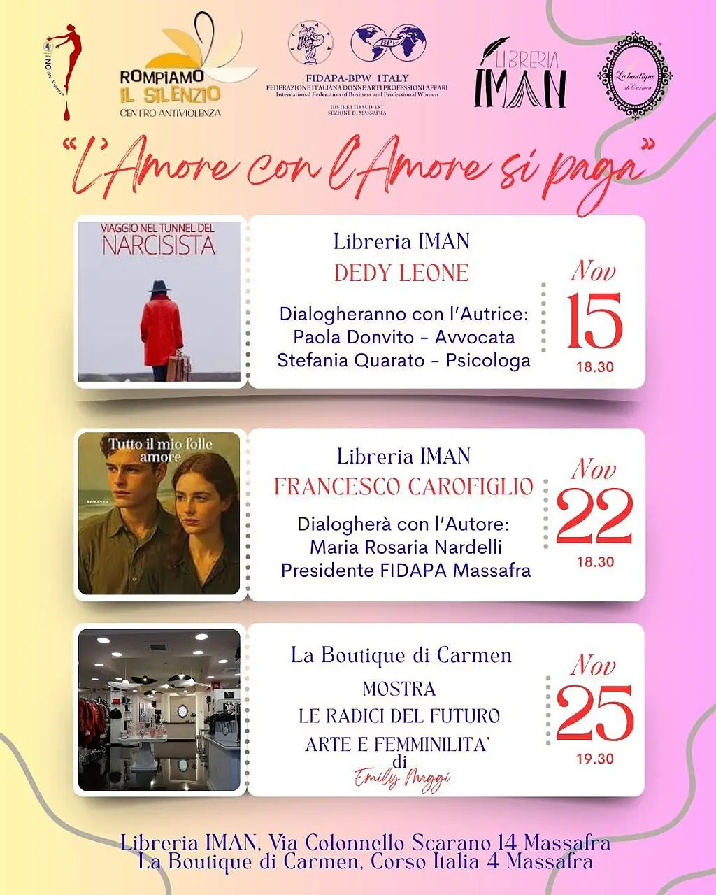 Nel mese che il Ministero ha dedicato al contrasto della violenza sulle donne, la sezione FIDAPA di Massafra ha messo in campo il progetto “L’Amore con l’Amore si paga”. A rendere possibile la rassegna composta da tre eventi, lacollaborazione del centro antiviolenza Rompiamo il silenzio.