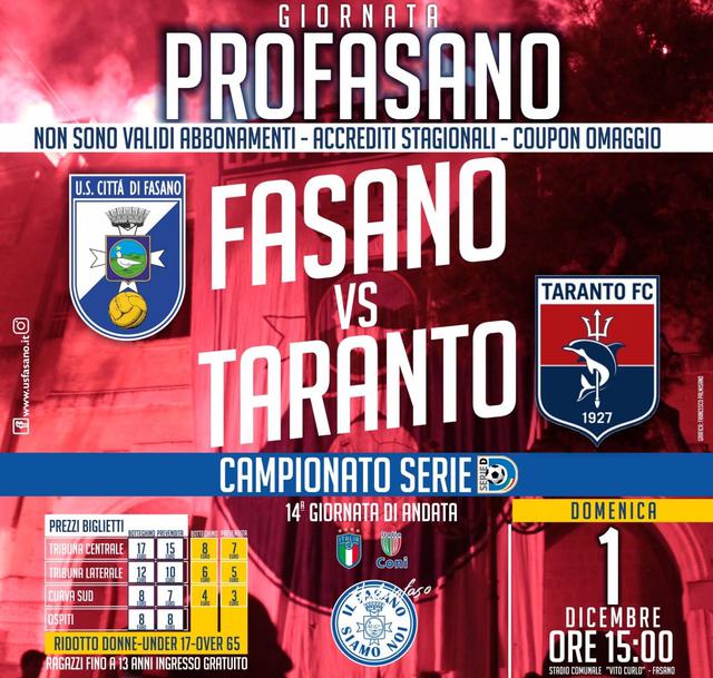 Per la sfida casalinga con il Taranto, in programma domenica 1 dicembre allo stadio "Vito Curlo", il Fasano ha indetto la "Giornata Profasano". Per l'occasione, non saranno validi abbonamenti, accrediti stagionali e coupon omaggio. Il costo del settore ospiti è di 8 euro.