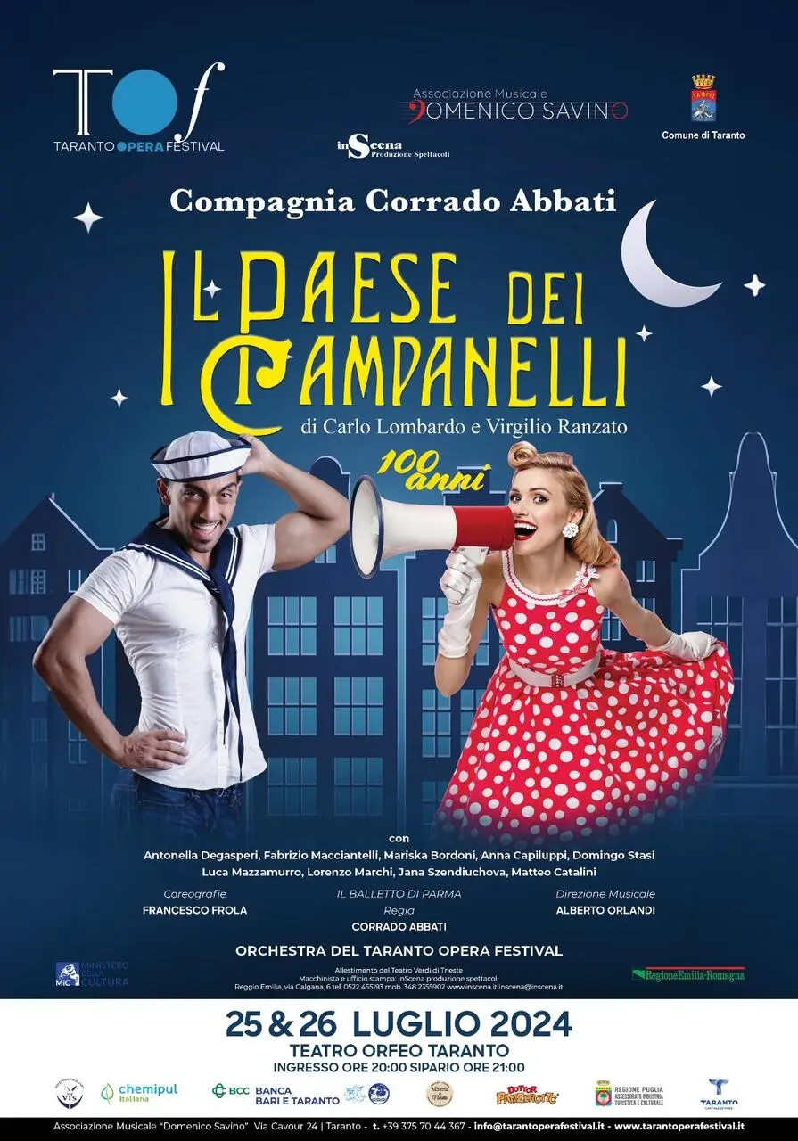 Sarà l’operetta “Il Paese dei Campanelli” a chiudere il 25 e 26 luglio prossimi la stagione estiva 2024 del Taranto Opera Festival. Per la prima volta nei cartelloni del Taranto Opera Festival, “Il Paese dei Campanelli” è un’opera in tre atti di Carlo Lombardo e Virgilio Ranzato, nuova drammaturgia e regia di Corrado Abbati, direzione musicale di Alberto Orlandi, coreografie di Francesco Frola. Quest’operetta ha festeggiato il centenario, fu rappresentata per la prima volta a Milano nel 1923. In scena, al teatro Orfeo di Taranto (ingresso ore 20, sipario ore 21, per entrambe le serate), ci sarà la Compagnia Corrado Abbati; suonerà l’orchestra del Taranto Opera Festival.