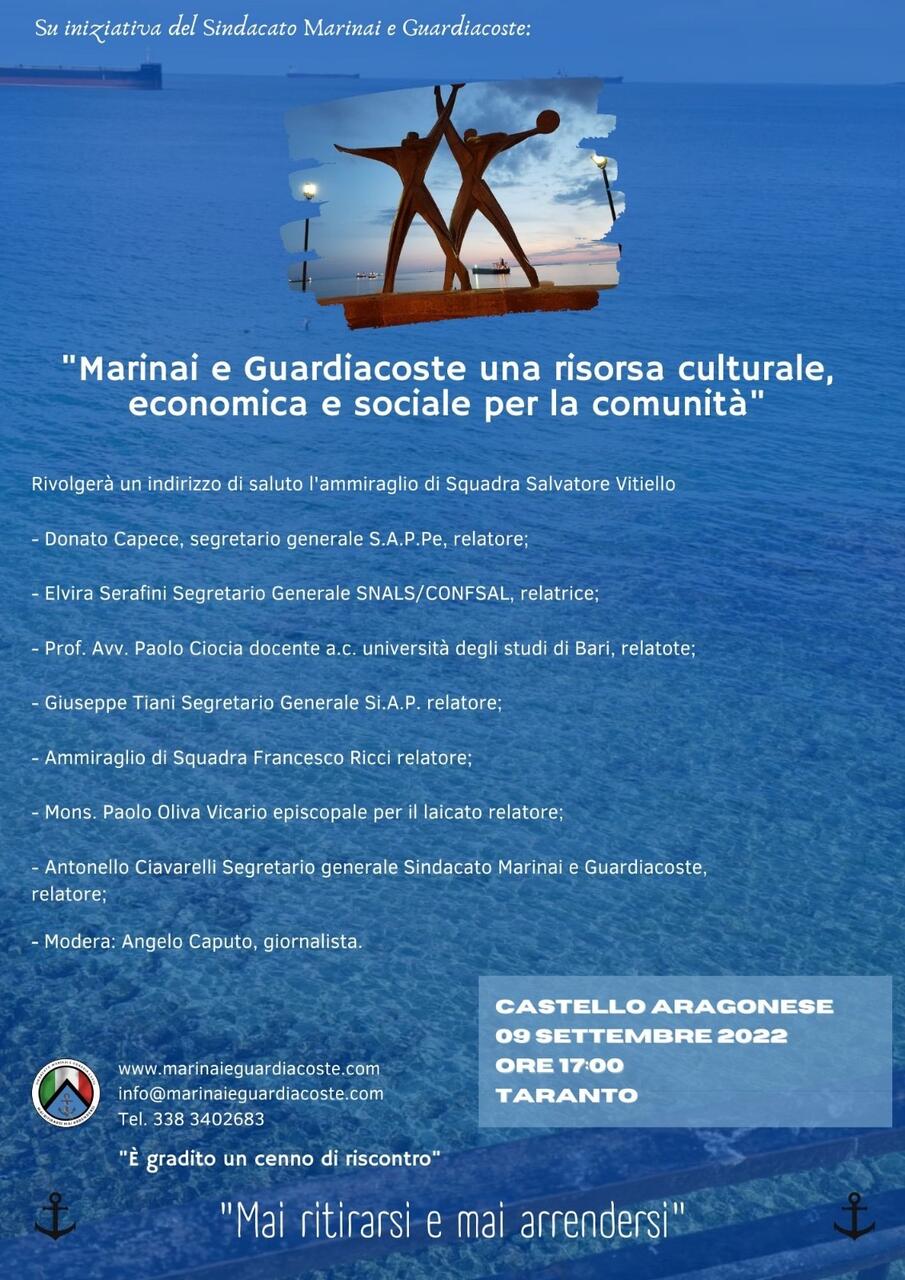 Venerdì 9 settembre, alle ore 17.00, al Castello Aragonese di Taranto, incontro di attualità per il mondo militare e la comunità ionica. lo scorso aprile è stata approvata la legge che riconosce ai militari la libertà di organizzarsi in sindacato.,La categoria dei marinai, nel comparto sicurezza e difesa, è la più numerosa in città e ora, grazie a questa nuova opportunità, i militari potranno assumere un ruolo maggiore per unire gli interessi dello Stato e il bene del territorio in cui vivono. Com questi intenti, grazie alla presenza di prestigiosi relatori, il sindacato marinai e guardiacoste ha organizzato un convegno per riflettere su un futuro che ci vedrà sempre più impegnati al servizo dei cittadini.