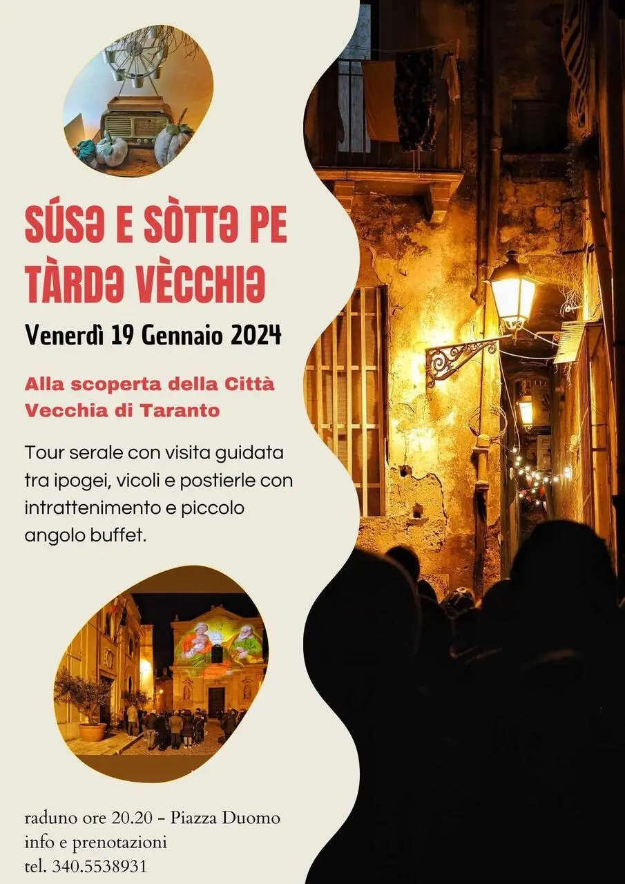 La nuova data è venerdì 19 gennaio e ha come filo conduttore la voglia di rivalutare la grande ricchezza storica-artistica, le tradizioni e tutte le eccellenze con i racconti e i sapori della nostra terra. Un percorso in notturna, con le luci caratteristiche della sera, che si snoderà súsə – tra postierle, vicoli e mura greche – attraverso un viaggio nella storia e sòttə negli ambienti ipogei (dove le pietre parlano e raccontano la nostra Taras, Tarentum, Taranto) in cui passano la fondazione greca e la rinascita bizantina. Il tutto impreziosito dalle narrazioni della sapiente guida Alessandro Ricci, che porterà i partecipanti per due ore circa alla scoperta dei tesori ignoti del borgo antico. Al termine della passeggiata, la serata sarà arricchita da un piccolo angolo buffet presso “La casetta sull’albero” in vico Porto.