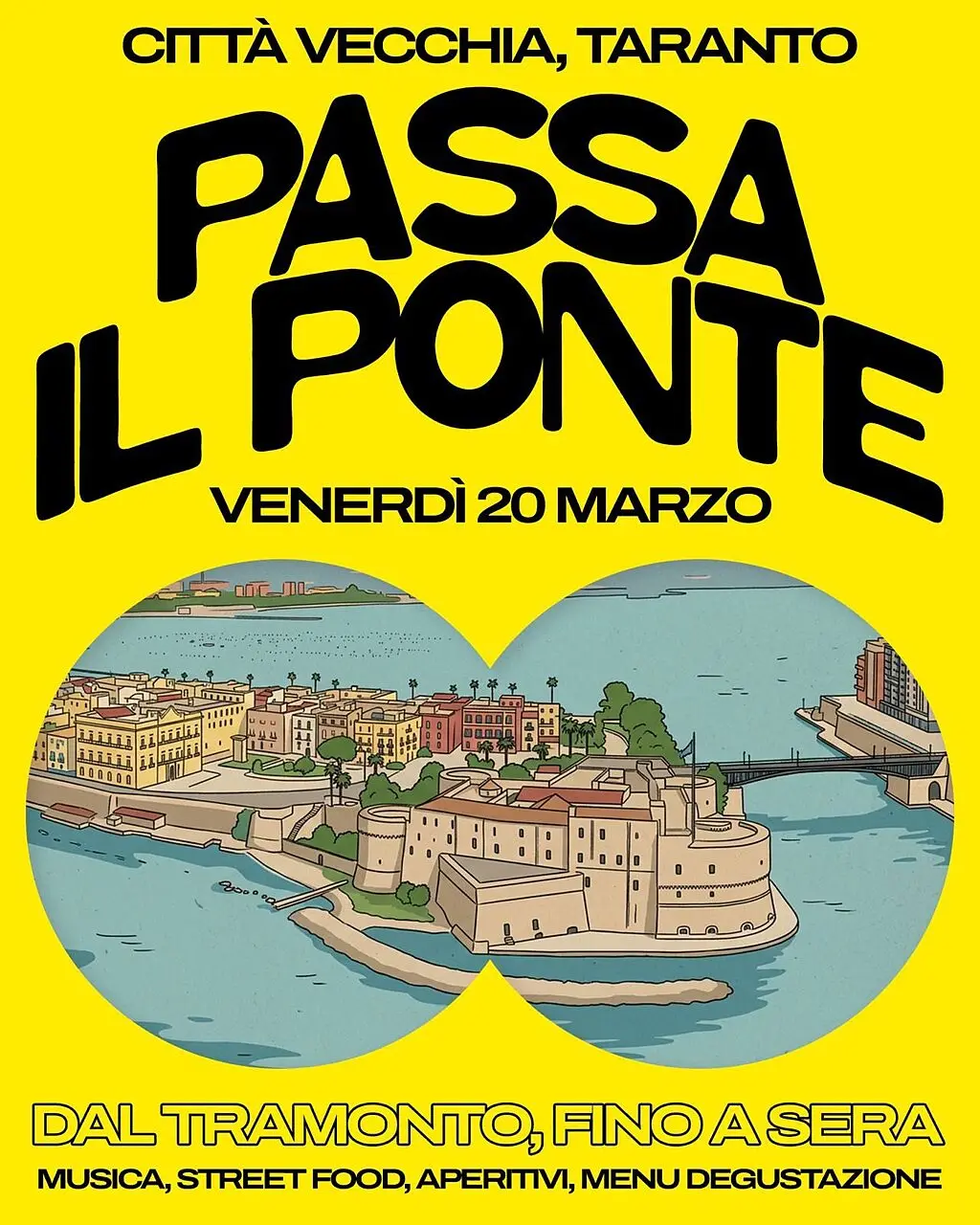 “Passare il ponte” è un invito alla cittadinanza attiva e, allo stesso tempo, un’occasione per riscoprire il piacere di stare insieme. Sostenere queste attività significa alimentare un’economia reale e locale, preservando l’identità di Taranto e offrendo prospettive concrete ai giovani che decidono di restare e scommettere sulla propria città. Significa anche vivere una serata speciale nel cuore del quartiere vecchio, lasciandosi coinvolgere dall’intrattenimento e dai sapori della nostra tradizione: tra musica, arte e la migliore offerta enogastronomica locale, l’Isola torna a essere il punto d’incontro ideale per chi cerca bellezza e buona compagnia.