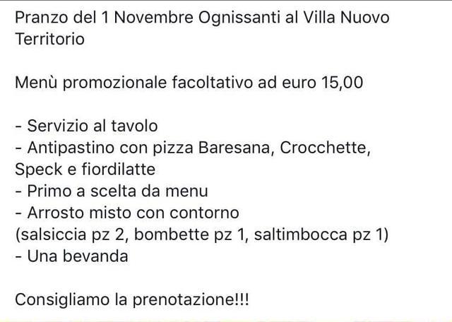 Continunano le novità presso il rinomato locale pulsanese "Villa Nuovo Territorio". Di fatto per giorno 1 novembre (Ognissanti) lo staff organizza un menù promozionale a soli 15 euro (che segue). E' consigliata la prenotazione.