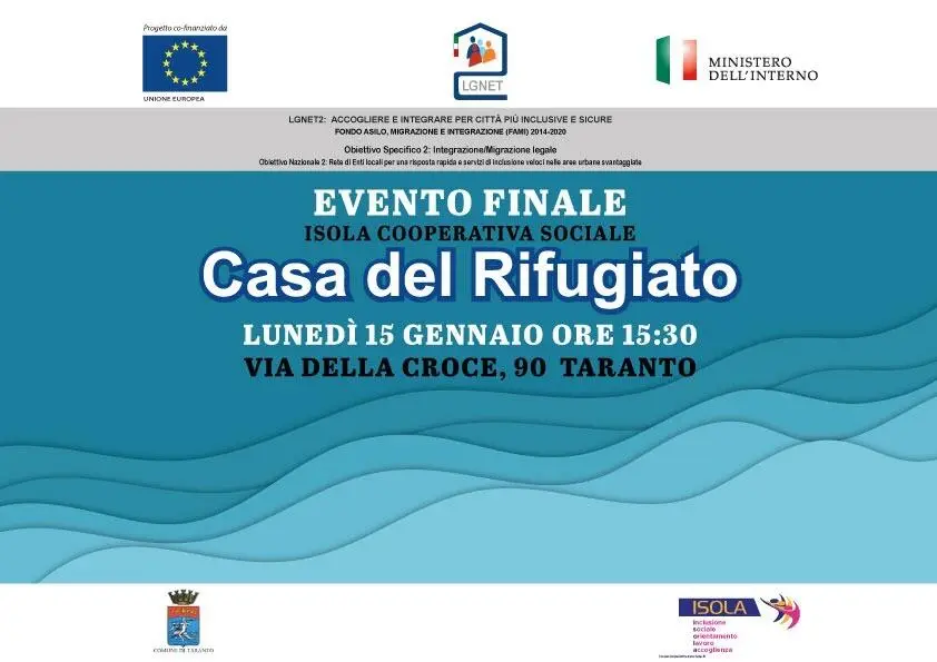 E’ con questa visione strategica che è stato finanziato il programma europeo LGNet2 in 16 grandi città italiane, realizzato dall’ANCI in partenariato con il Ministero dell’Interno, affidato alla I.S.O.L.A. Cooperativa sociale per la sua realizzazione nel Comune di Taranto, i cui incoraggianti risultati saranno discussi il 15 gennaio nella Casa del Rifugiato, nel corso di un incontro al quale parteciperanno rifugiati, operatori sociali, autorità istituzionali e rappresentanti della società civile.