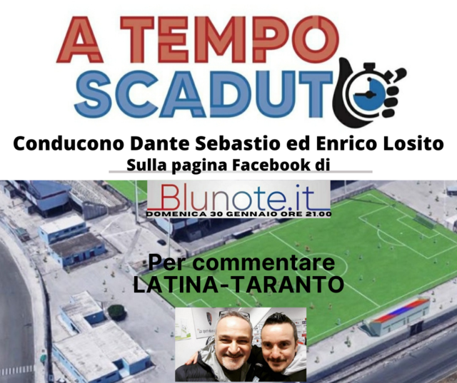 Questa sera domenica 30 gennaio dalle ore 21:00, appuntamento con “A TEMPO SCADUTO”, il contenitore sportivo a cura della redazione di Blunote.it: analizzeremo a caldo la gara Latina-Taranto con le vostre domande e considerazioni. Ospiti di Dante Sebastio ed Enrico Losito, coadiuvati da Rosanna Pisani: l’allenatore Salvatore Ciullo, doppio ex del confronto, il procuratore sportivo Luca Pensi e l’opinionista Roberto D’Onofrio. Vi aspettiamo in diretta sulla pagina ufficiali Facebook e Youtube di Blunote Web dalle ore 21:00! Il programma è stato realizzato grazie al supporto di Birroteca Puglia in Via Nitti, 14 a Taranto; Pausa Caffè in Viale Trentino 5B-7 a Taranto; Hotel Virgilio in Viale Virgilio, 4 a Taranto; Ipersport in via per S. Giorgio Jonico km 10 (contrada Cimino) a Taranto; Elettrica Martino in Via De Cesare, 8/10 a Taranto; IL.MET in via Abruzzo, 73 a Taranto e inMasseria, via Liguria, 43 a Taranto.