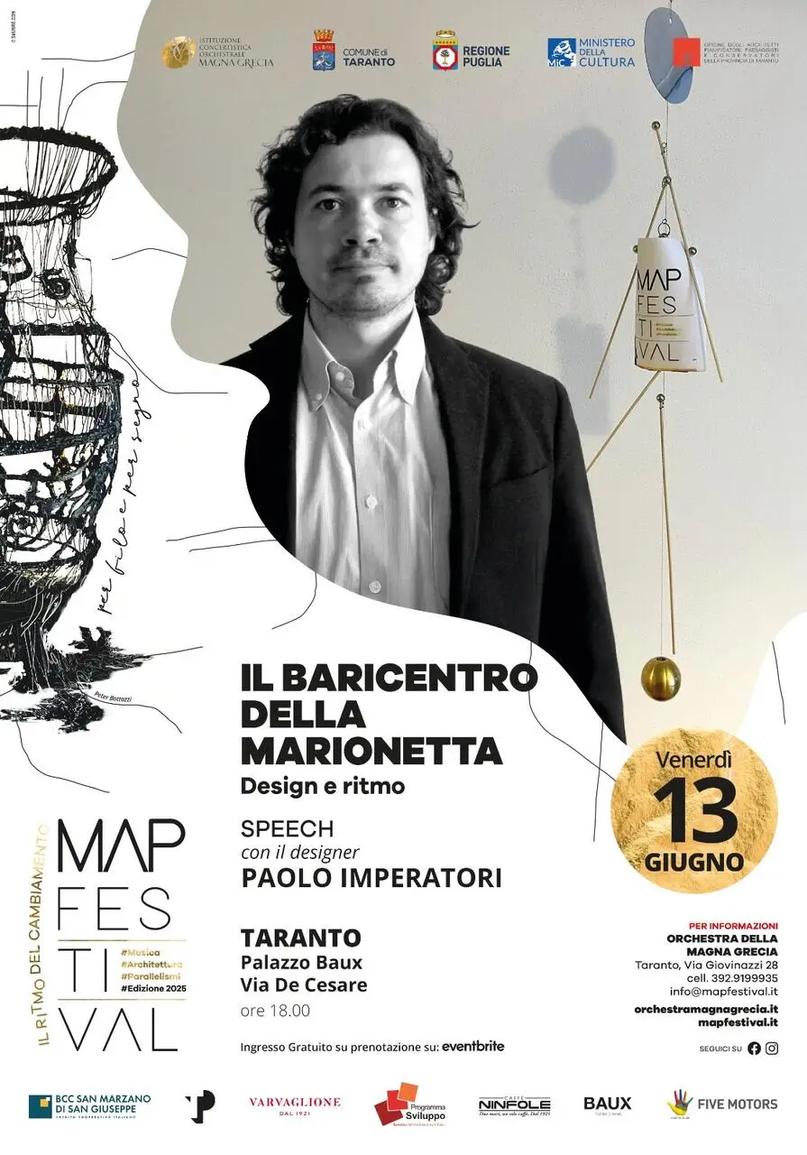 Un appuntamento da non perdere quello in programma venerdì 13 giugno alle ore 18.00 a Palazzo Baux, in via De Cesare, nell’ambito del MAP Festival 2025. Il protagonista sarà il designer Paolo Imperatori, con un duplice intervento: uno speech e una lectio magistralis dal titolo “Il baricentro della marionetta”.