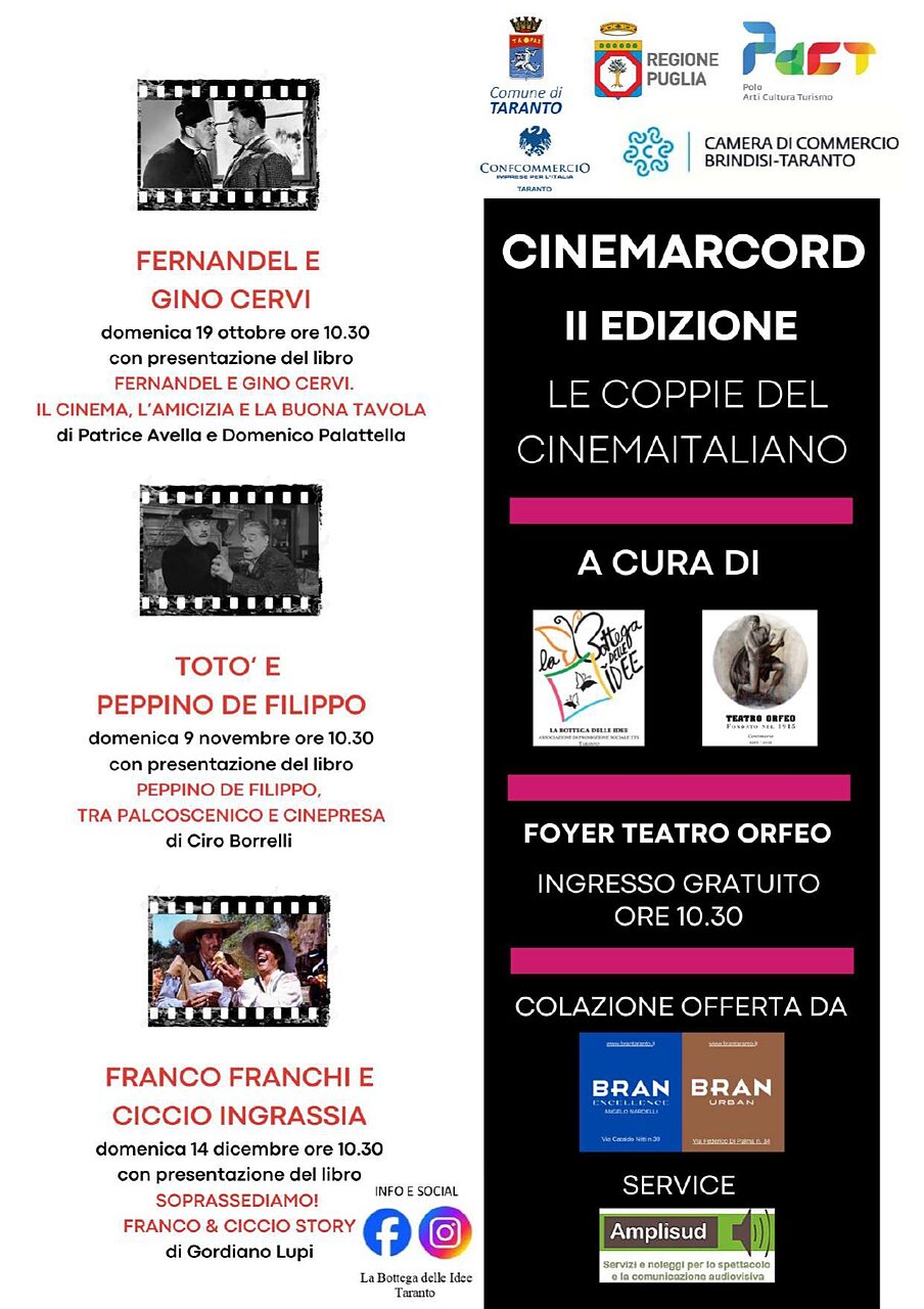 “Cinemarcord” è un progetto culturale innovativo che unisce memoria, arte e socialità, articolato in tre appuntamenti domenicali mattutini dedicati alle grandi coppie del cinema italiano. L’obiettivo è quello di creare un momento di incontro e condivisione, favorendo un modello di partecipazione culturale che stimoli la rinascita del borgo tarantino.