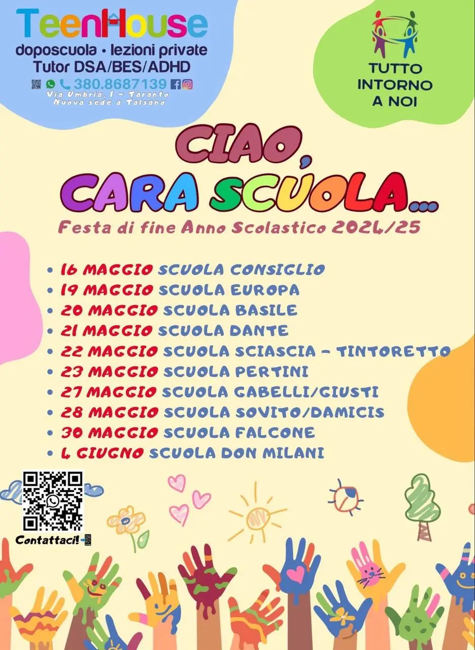 Dal 16 maggio al 4 giugno 2025 la città di Taranto si prepara a celebrare con gioia la conclusione dell’anno scolastico. Torna infatti la tradizionale manifestazione “Ciao, cara scuola”, ideata da Michele Elmo, vicepresidente dell’APS Tutto intorno a noi, e rivolta ai bambini delle scuole dell’infanzia e primaria.