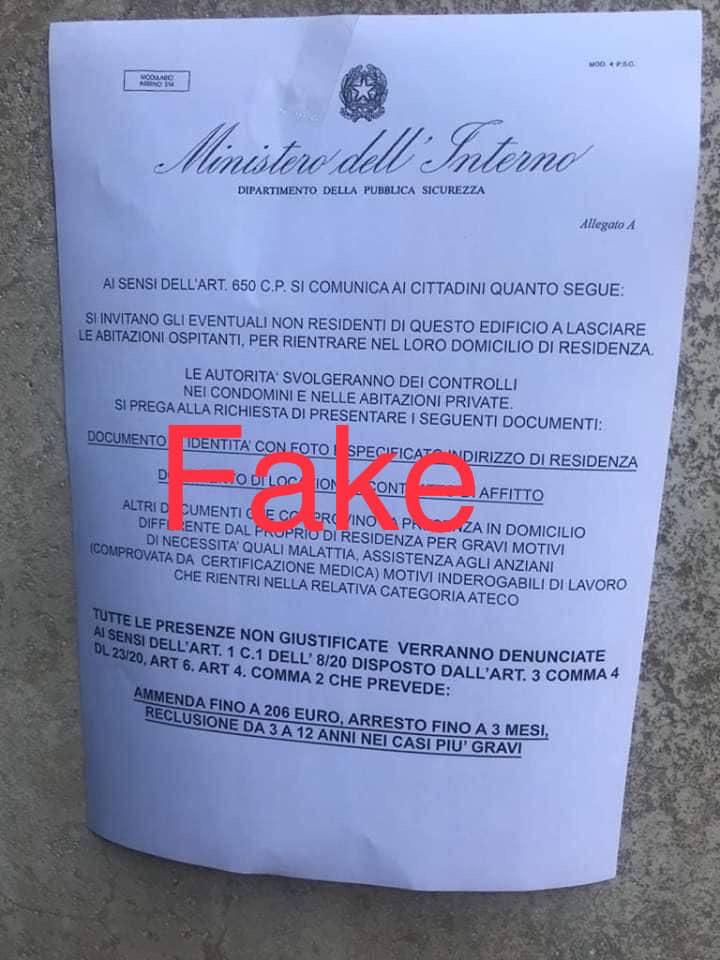 In alcuni quartieri di Taranto (ci segnalano ad esempio nella zona di Talsano) sono stati ritrovati alcuni volantini stampati su carta intestata “Ministero dell’Interno Dipartimento della Pubblica Sicurezza” con il logo della Repubblica Italiana, in cui viene chiesto ai non residenti degli stabili di “lasciare le abitazioni ospitanti per rientrare nel proprio domicilio di residenza”. Questo volantino circola anche a mezzo whatsapp. È tutto falso oltre che pieno di “orrori” dal punto di vista giuridico. Quindi massima attenzione! Invitiamo i cittadini a non tenere assolutamente in considerazione questi volantini, a non lasciare le proprie abitazioni e a denunciare ogni tentativo di controllo non autorizzato. (Assessore Francesca Viggiano)