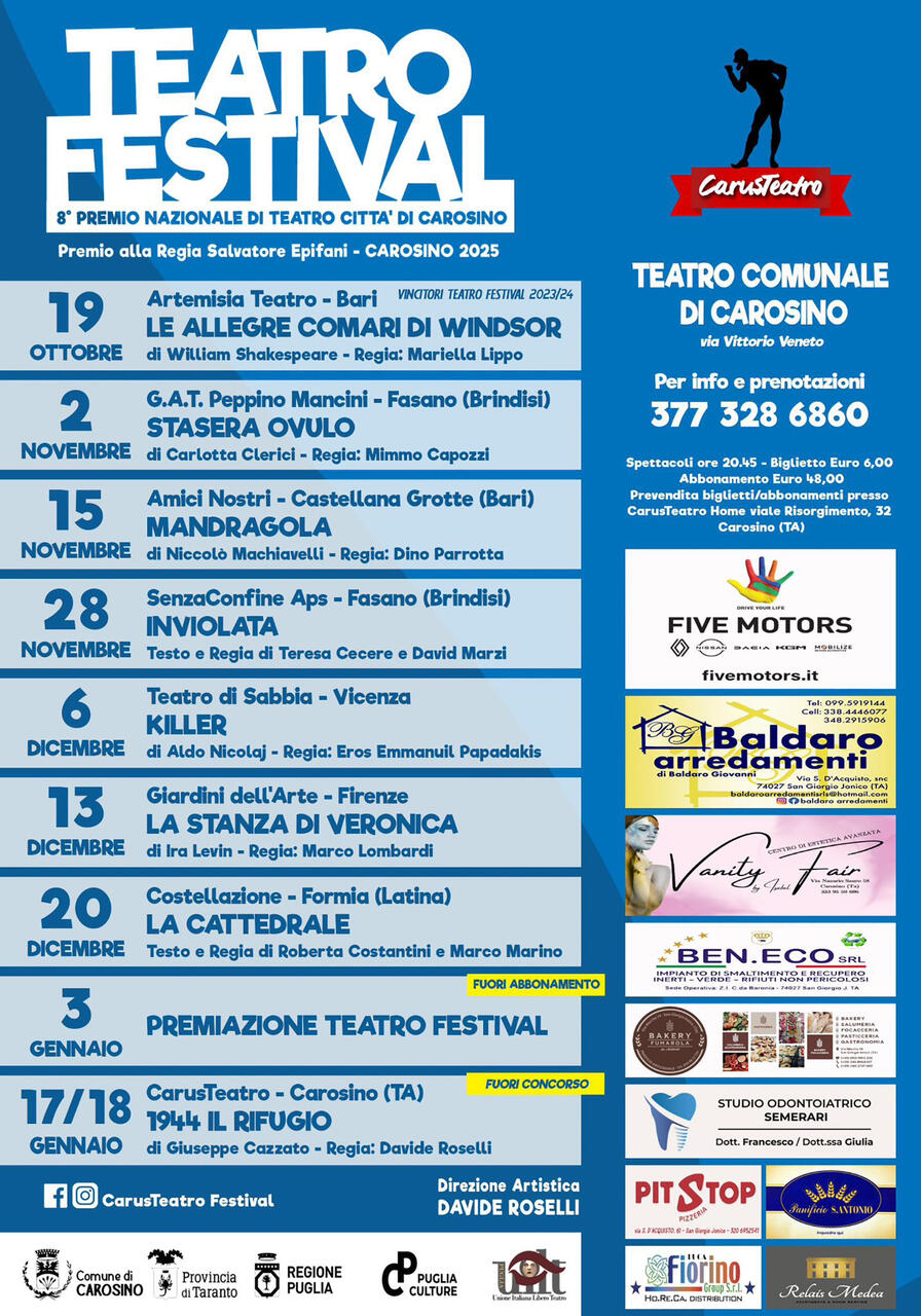 Torna Teatro Festival “Premio Nazionale di Teatro Città di Carosino”, la rassegna teatrale di CarusTeatro Aps che, con la Direzione Artistica di Davide Roselli, in questa ottava edizione vedrà sette importanti compagnie amatoriali italiane proporre i loro lavori teatrali. Oltre le sette rappresentazioni, il cartellone prevede anche tre “date” fuori abbonamento: il 3 gennaio è prevista la premiazione, mentre il 17 e il 18 gennaio la compagnia CarusTeatro proporrà “1944 Il Rifugio” di Giuseppe Cazzato con la regia di Davide Roselli.