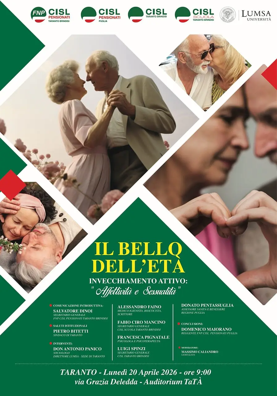 TARANTO – Affettività e sessualità nella terza età al centro del convegno “Il bello dell’età – Invecchiamento Attivo: Affettività e sessualità”, in programma lunedì 20 aprile alle ore 9:00 presso l’Auditorium TaTÀ di via Grazia Deledda.